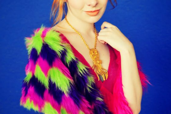 I chose a two tone combination of checkered cheshire-cat faux fur and neon pink shag for my stole, with turqoise lining.