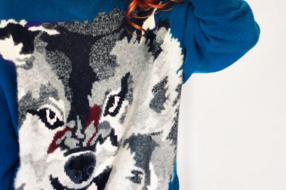 My mom got this 80's Krizia wolf sweater at a Salvation Army sale, along with two other Krizia animal sweaters. I had to try them on right away! The wolf looks like hes going to leap off my chest.