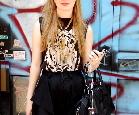 Today I wore silk Dries van Noten boxing shorts, an American Apparel tank, thrifted sunglasses, Stella Mccartney sandals along with the vintage faux-fur and necklace. And my dinosaur Prada bag, as always!