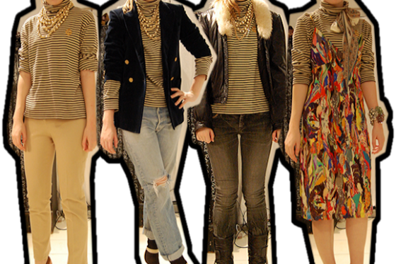 Sometimes just the act of putting on a piece of clothing can give you a lot of ideas of how to wear it. I'd been thinking about how to wear this Ralph Lauren striped turtleneck (with a cute little embroidered emblem on it) and tried on the first outfit, tweaked it until it became the second outfit, which evolved into the third outfit, etc etc