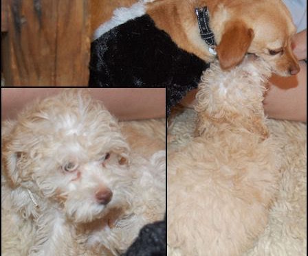 Meet Shelley, the newest resident in the Sea of Shoes household as of Friday. She's a three month old 'maltipoo' (stupid name, cute breed-its a maltese and poodle mix) and is the cutest tiniest thing you've ever seen. Staci-the hideous orange oversized rat with catfish whiskers you may have glimpsed on Sea of Shoes from time to time-feels very threatened by our designer puppy. To add injury to insult she's been wearing a skunk costume for a good part of this weekend as well. Poor Staci…she's still my favorite dog.
