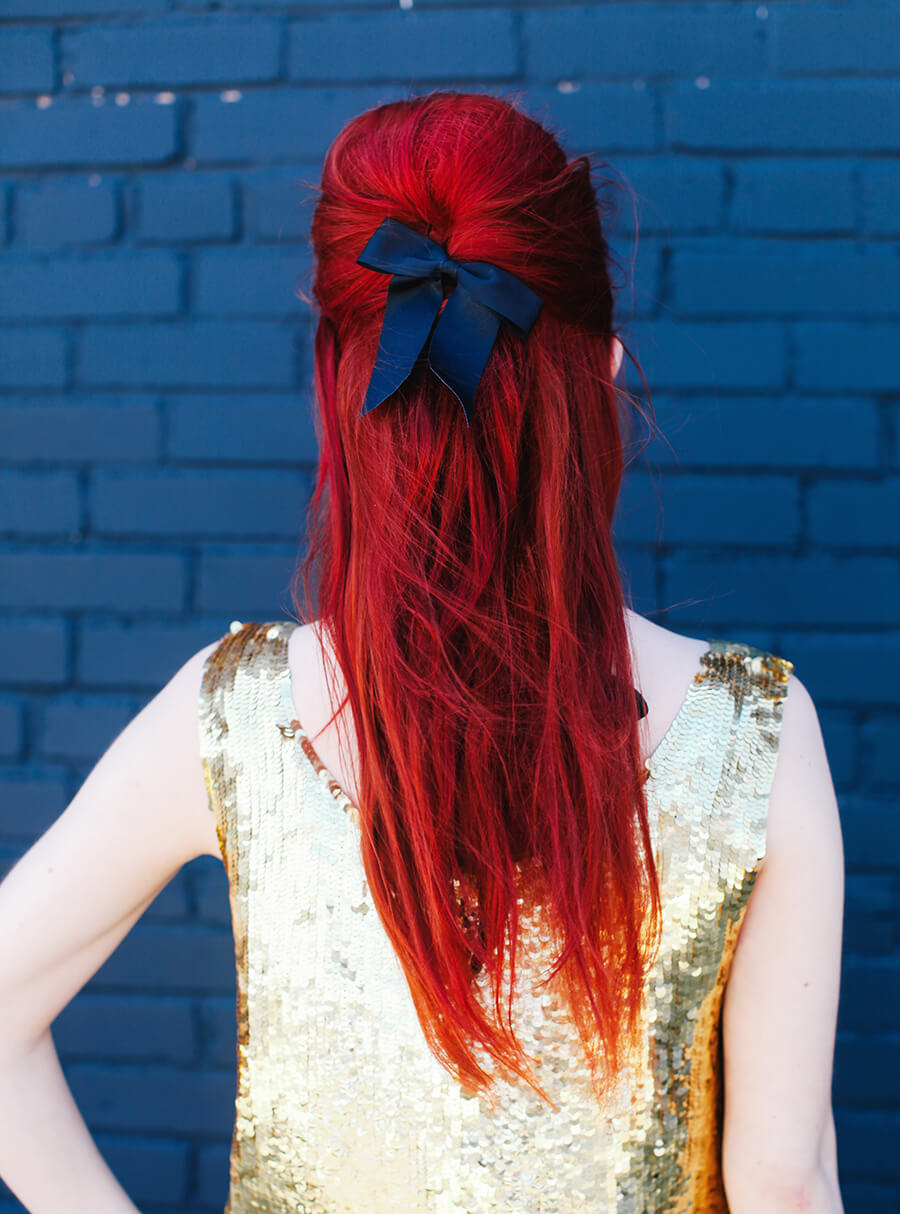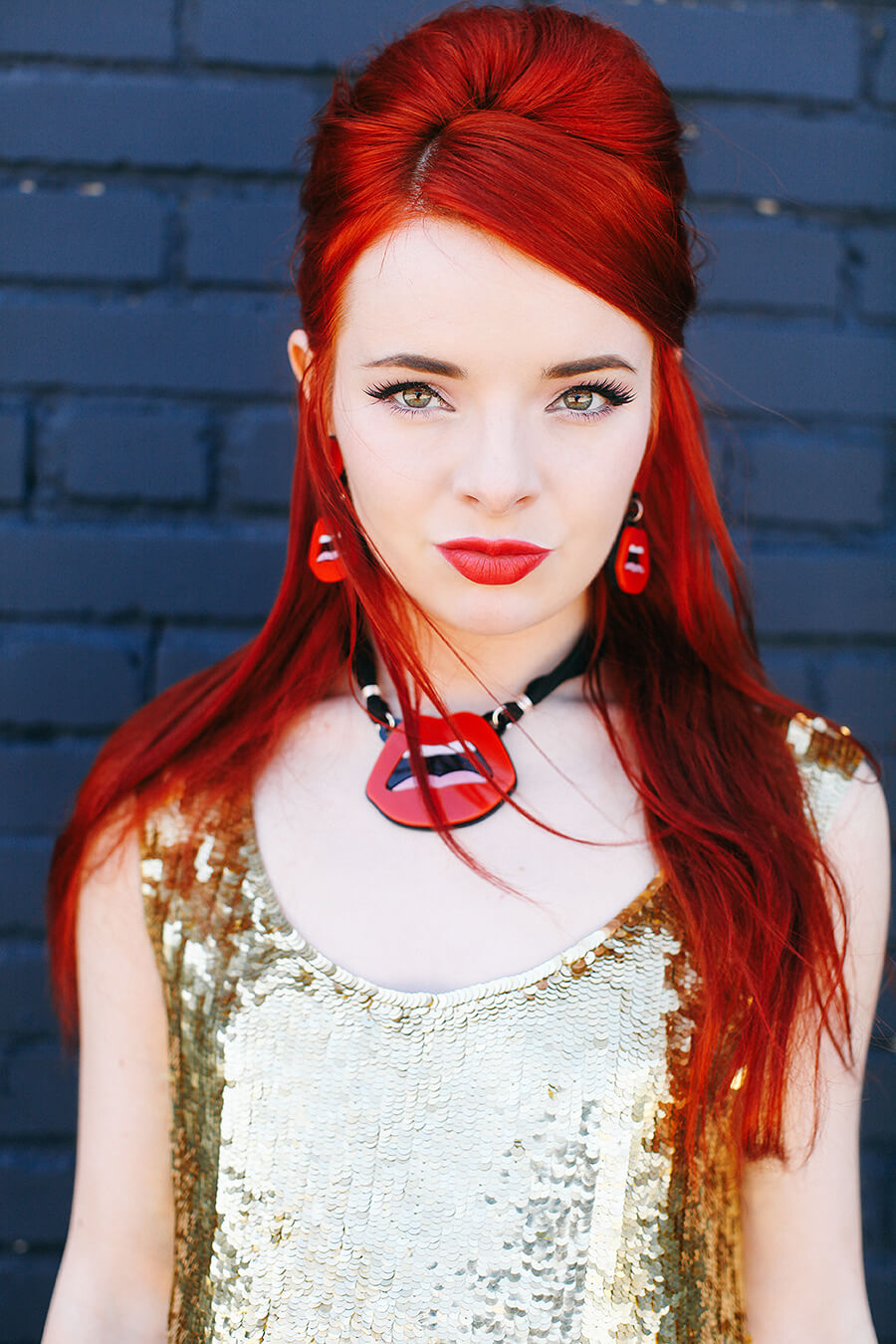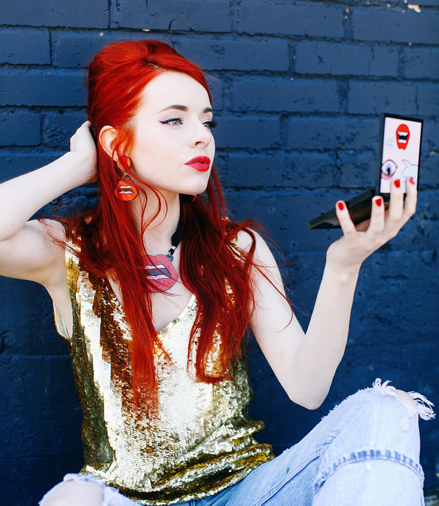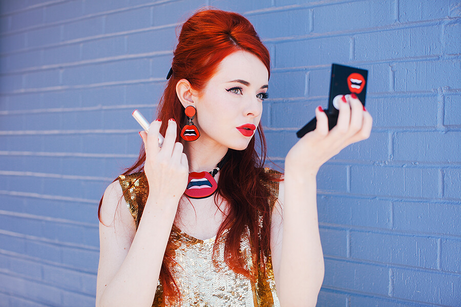 I love makeup and I love Yaz Bukey’s fantastic Plexiglas accessories, so I’ve been really excited for the shu uemura and Yaz Bukey summer artist collaboration that just came out! The adorable packaging and pop-art color palette of the collection are a makeup addict’s dream come true. shu uemura and Yaz Bukey were kind enough to send me the “Sexy Yaz” products, along with Yaz’s amazing signature red lip earrings and necklace. Most of the time my beauty style is pretty natural and laid back, but I love the artistry behind makeup. Sexy Yaz is part of the #AlterShuGo personas. I decided on a daring red lip (rouge unlimited lipstick in sexy yaz), big bouffant, and 60s sequin top to channel my inner Sex Yaz.
