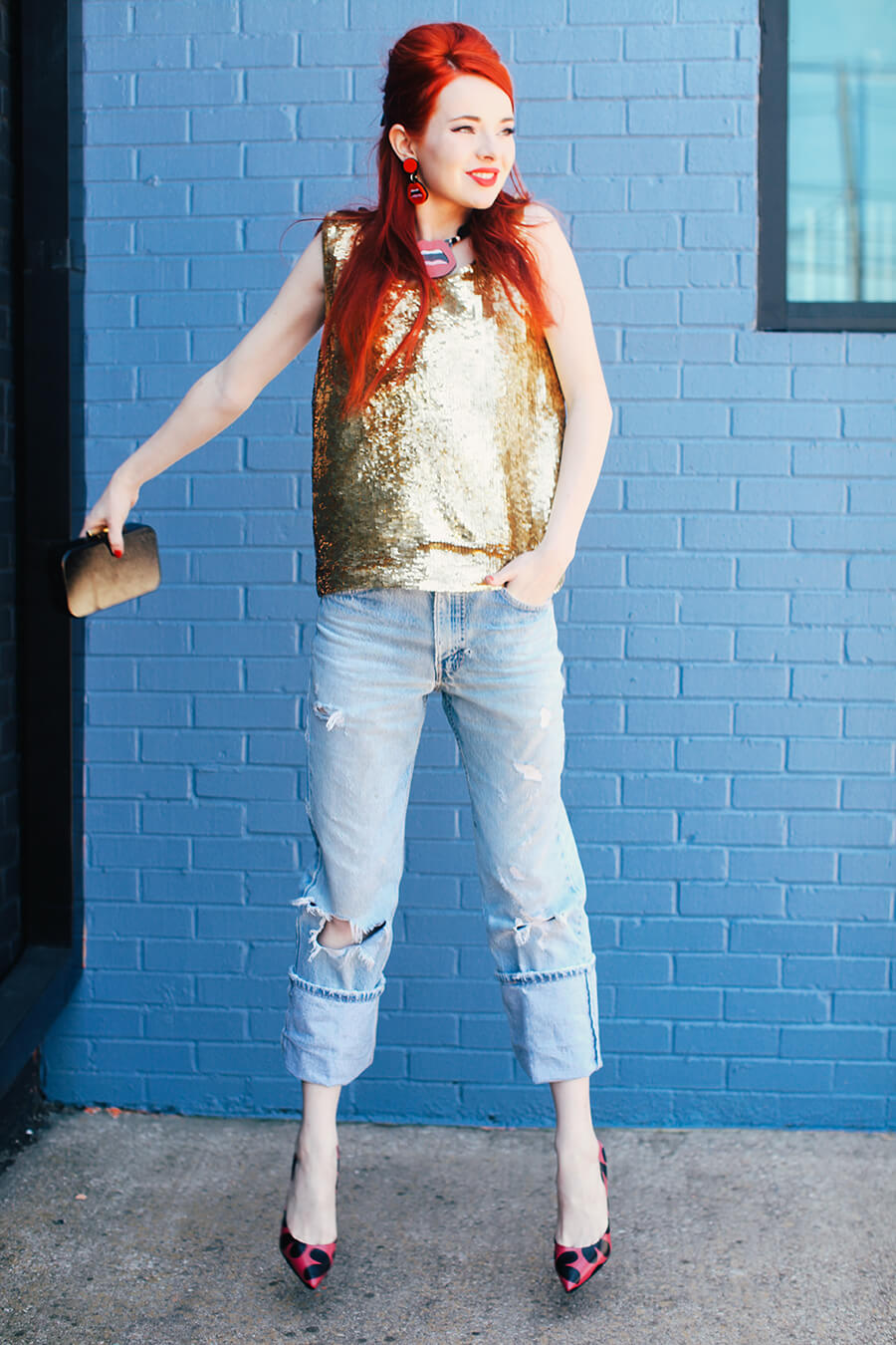 I am wearing a vintage sequin tank top, vintage Levi’s, and Saint Laurent pumps with a Devi Kroell clutch.