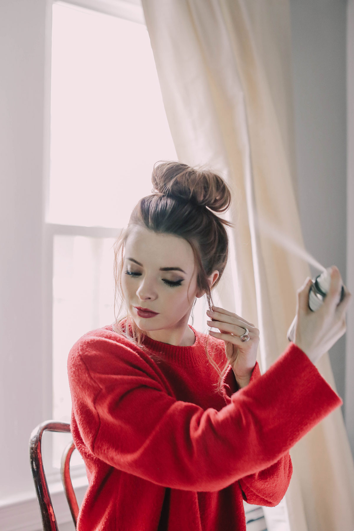 Spritz your bun and roots with the texture spray, and gentle massage your scalp to loosen the style and create flyaways. This style is ALL about looseness, texture, and the flyaways, so don’t be afraid to really mess it up!