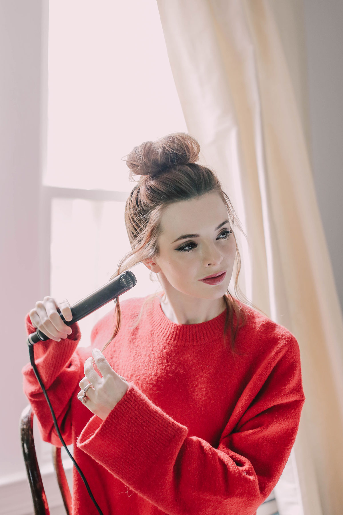 Using bobby pins, secure the bun to your liking, pulling and adjusting the bun for shape and volume. It doesn’t have to be neat! Next, we need to style the baby hairs. I use a flatiron and use a gentle wave motion as I move down the strand to create bend (not curl!). Do this on all of the baby strands you pulled out.