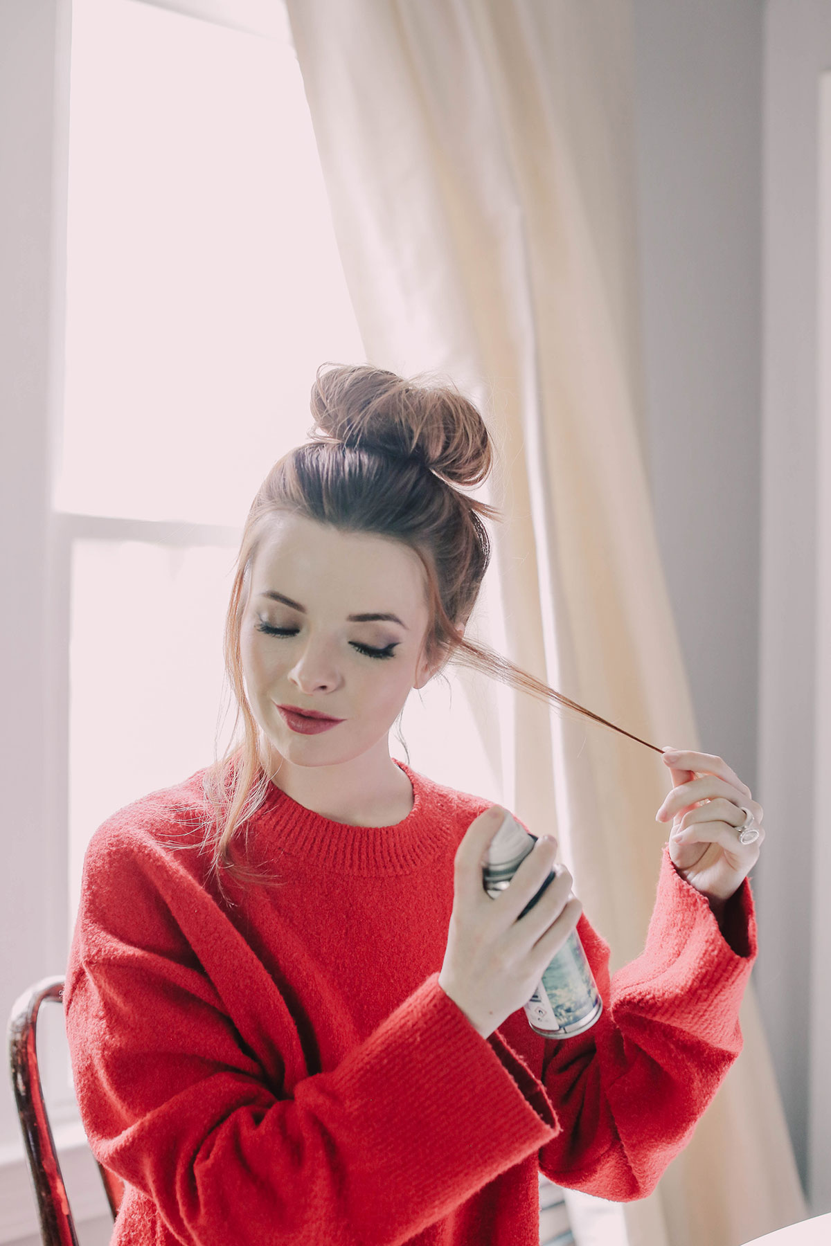 Let me start off my saying that this hairstyle is best on dirty hair. Great news, right? Slightly dirty hair will give you much better texture, hold, and volume for this style. I started with hair that was washed two days prior. I used Bumble and Bumble’s Pret a Powder Dry Shampoo to refresh my hair and absorb oil before starting this hairstyle.