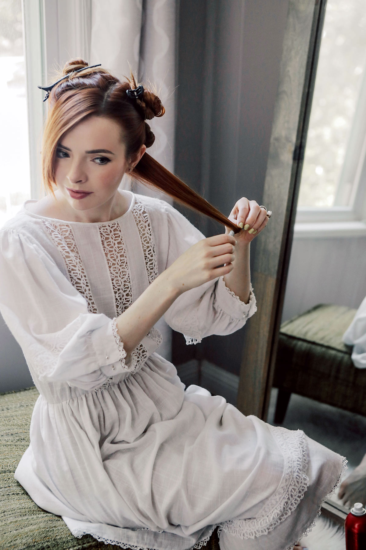 1. Start off with clean straight hair. You will need to set it in curls. The best way to do this in my opinion is with hot sticks (see above note). Comb your hair thoroughly. I separated my hair into a few sections with clips so I could put the curlers in one section at a time. It doesn’t particularly matter how you section off the hair, since this is all getting combed back into a braid later. To put in the hot sticks, grab 1 inch sections of hair, lift and comb the section straight, spritz the section with a mist of hairspray, and then wrap the ends of the hair around the hot stick, making sure you tuck all the ends underneath the roller as you roll. Roll all the way to the root of the hair, and then attach the ends of the hot stick together, pulling them tight so the roll sits close to the scalp. Repeat all over head.