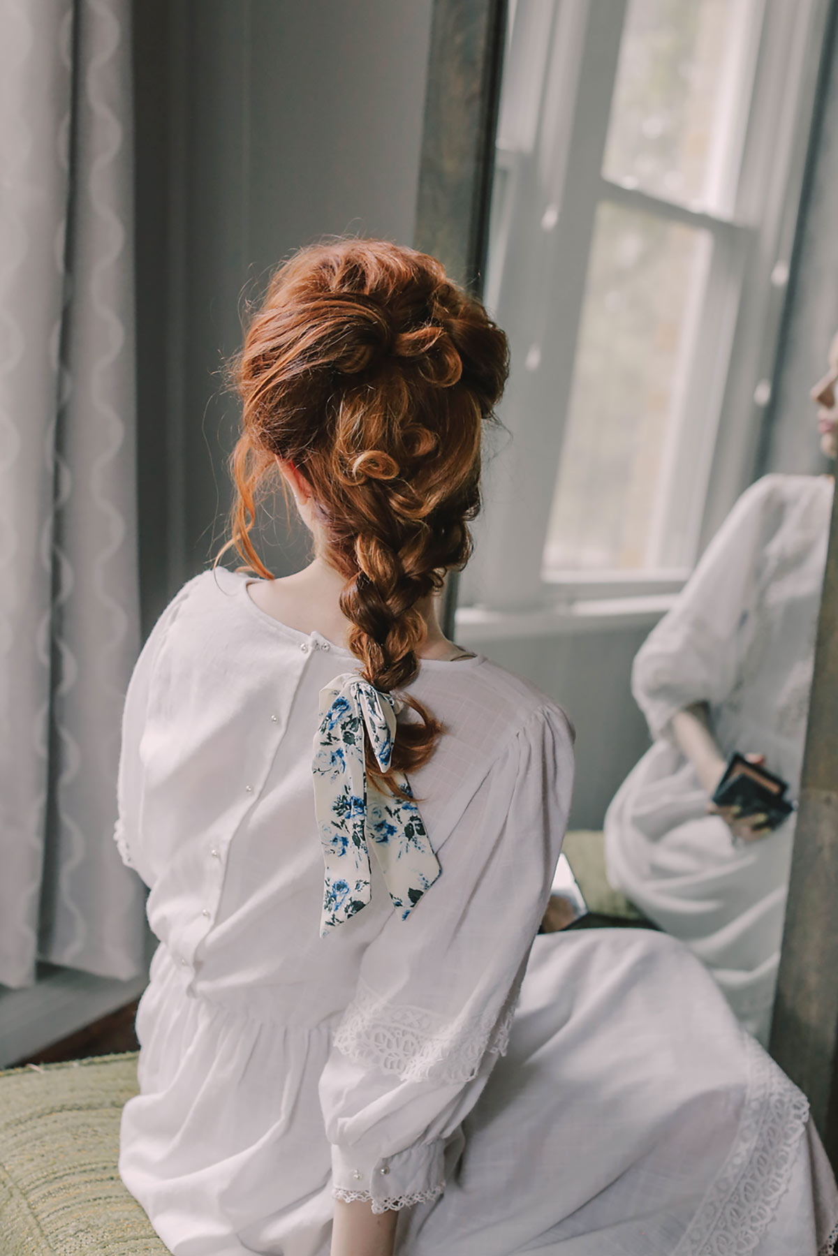 6. To finish the style, take the back section of hair and braid it into a low back braid. Fasten with an elastic or a scrunchie bow (the bow I am wearing is from the Laura Ashley for Urban Outfitters collection). Pull the braid loose by gently tugging on the braid for a more relaxed look.