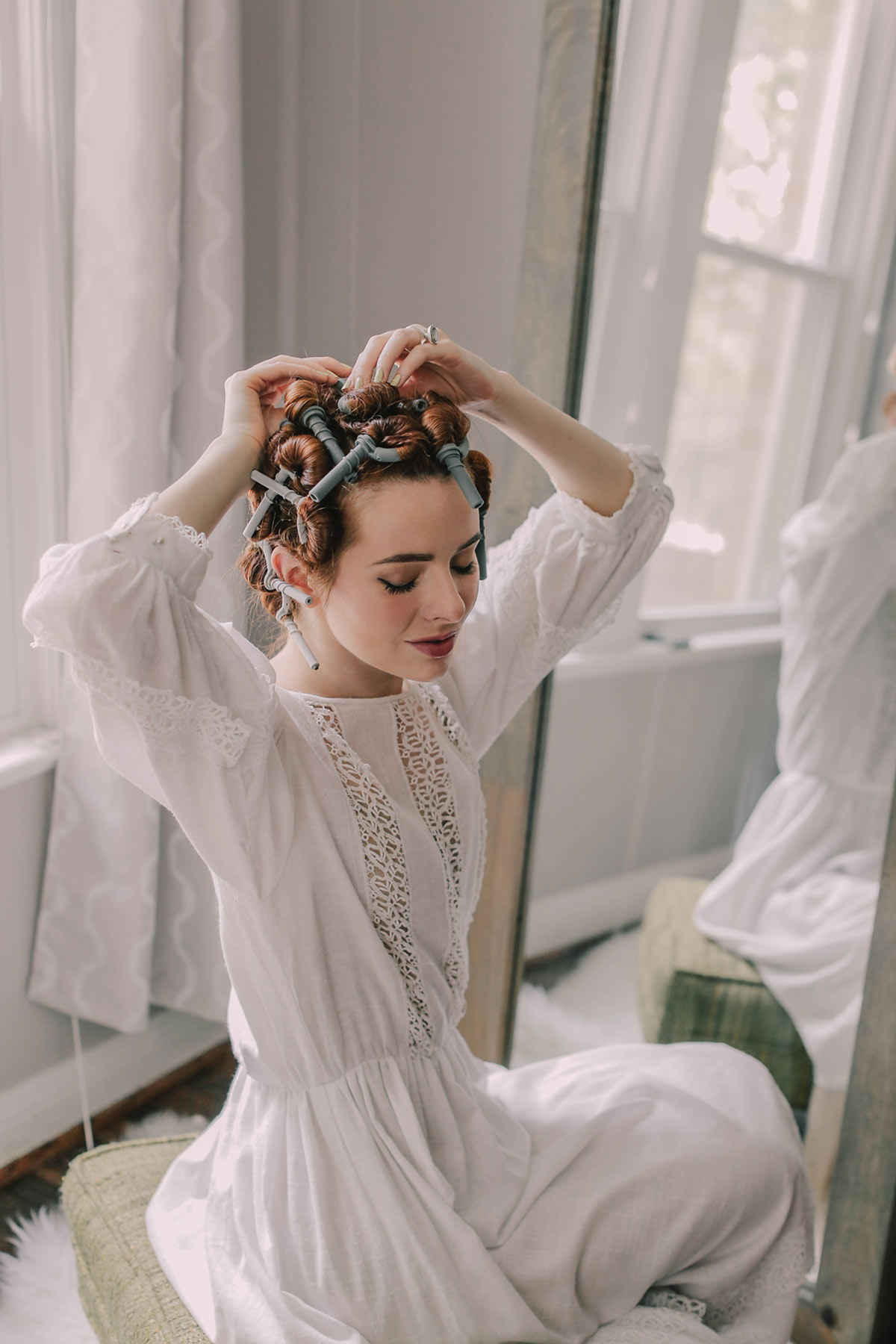 Note: You will notice I use a hair styling tool called “hot sticks”. These are my go-to styling tool for any kind of vintage hairstyling. They are great for creating hairstyles from the 1700’s all the way through the 1940s. They are little rubber rods that you wrap your hair around and attach together at the ends. They create very tight curls and a ton of body in the hair. If your hair does not hold curl well, these are a great styling tool. If you have any interest in vintage hairstyling, I definitely suggest buying some hot sticks. You can get them from Babyliss or Conair. I use the Babyliss Hot Sticks here. I like these better than the Conair hot sticks because the Babyliss has 20 rather than 14 rollers. I have hair that doesn’t hold curl well, so the more rollers the better for me. When you plug hot rollers in, allow at least 15 minutes for them to get hot.