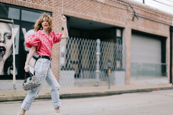 Wearing an 80s polka dot blouse with vintage Levi's, a thrifted belt, a Meredith Wendell handbag, clip on drop earrings, and Prada lipstick shoes from a few years back. …