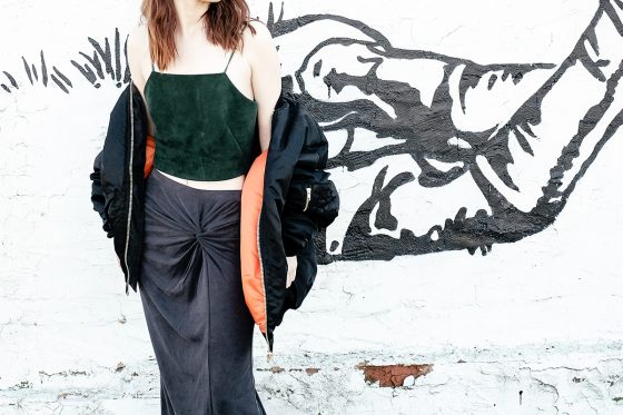 Wearing a knotted skirt by Bobeau with a Veda suede crop top, bomber jacket, D-frame sunglassses, and Giuseppe Zanotti buckle heels (similar here). …