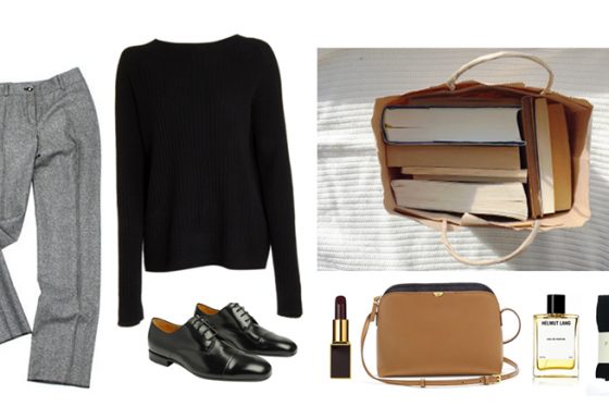 Mohair jacket by Veda, Everlane boxy striped tee, grey blanket scarf, cuffed boyfriend jeans, and Armani shoes. …