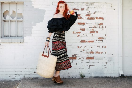 #VOOTD = vintage outfit of the day! Wearing a vintage crop ruffle blouse and a 70s Anne Klein tapestry skirt with vintage bangles, a straw tote, and Polo Ralph Lauren clogs. I love a clog and a …