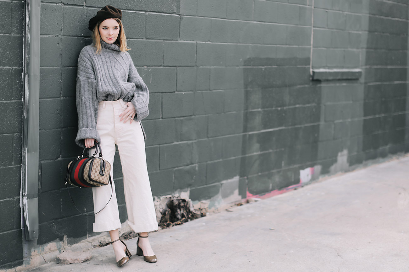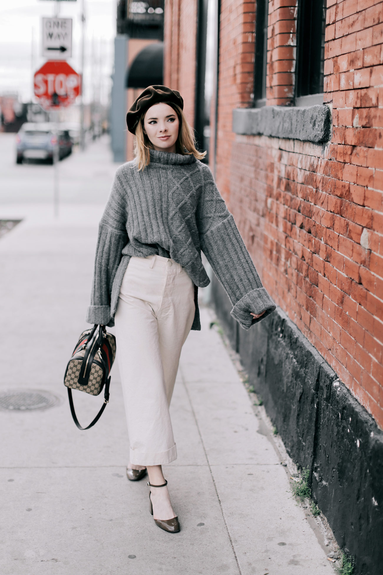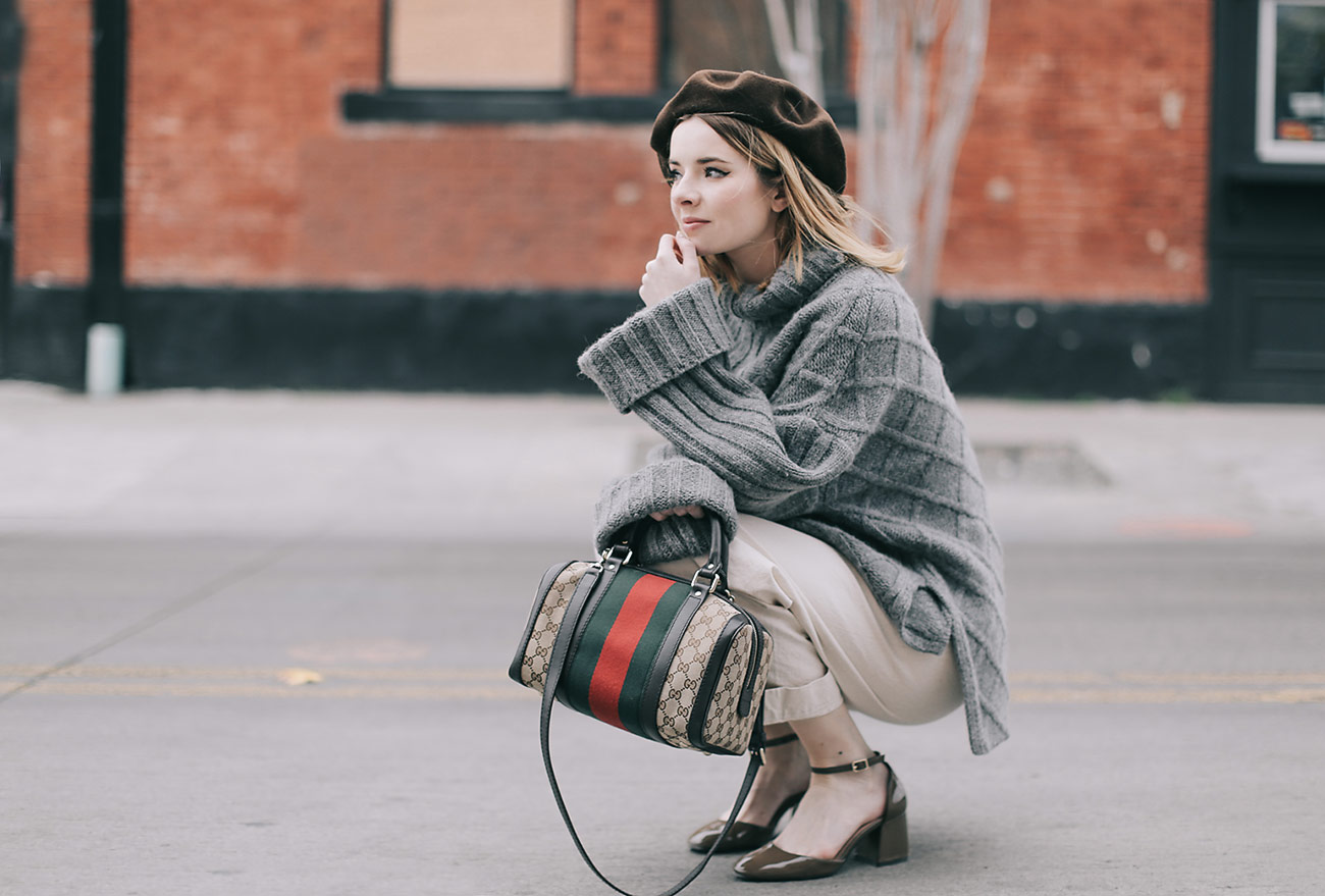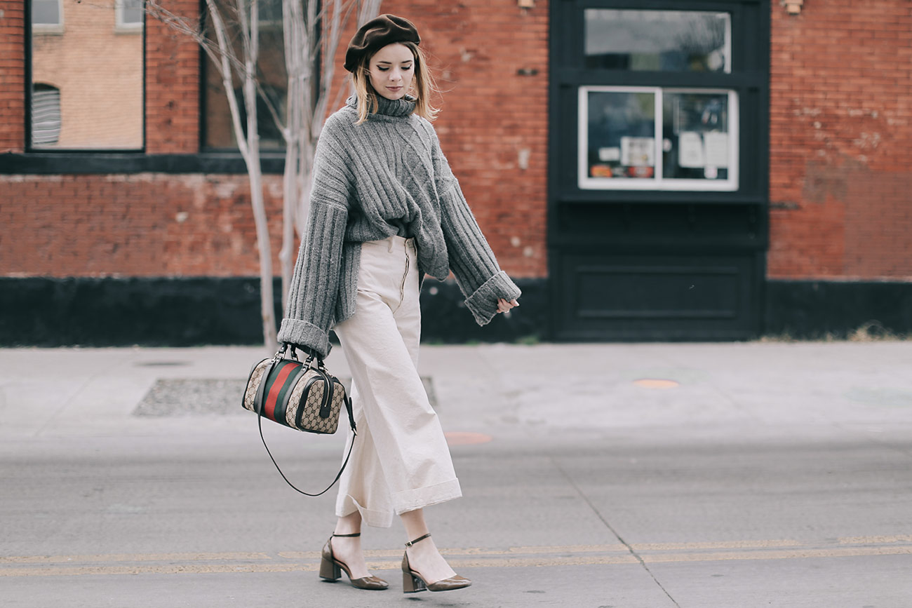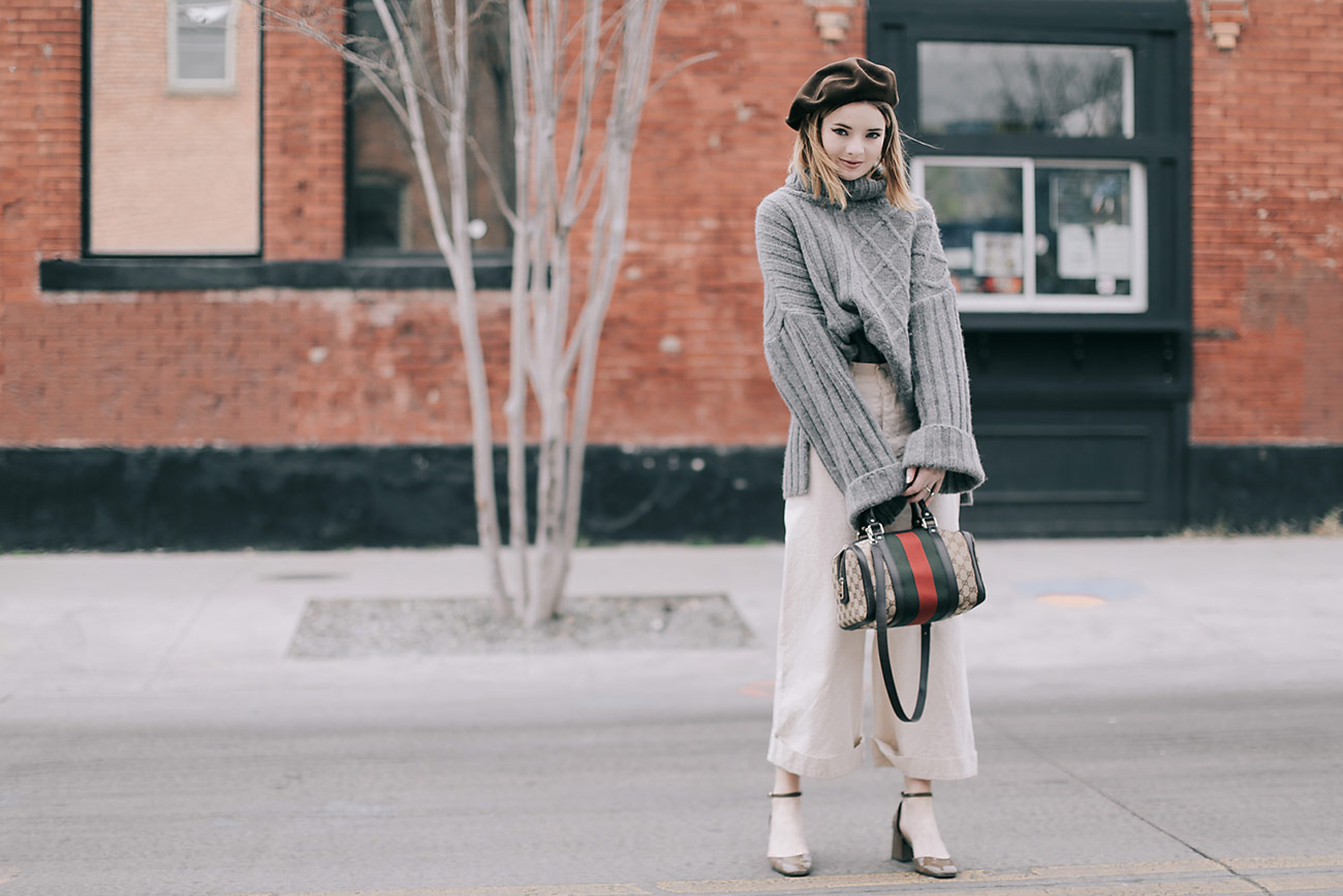 Wearing Jesse Kamm white pants with a grey turtleneck sweater , a brown beret, a Gucci bag, and Zara shoes.