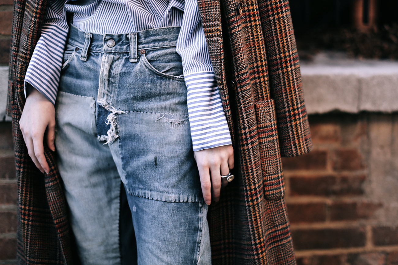 Wearing vintage denim patchwork jeans with a StyleNanda blouse, a 70s Bill Blass tweed duster coat, and shoes from Chloe’s spring 2008 collection.