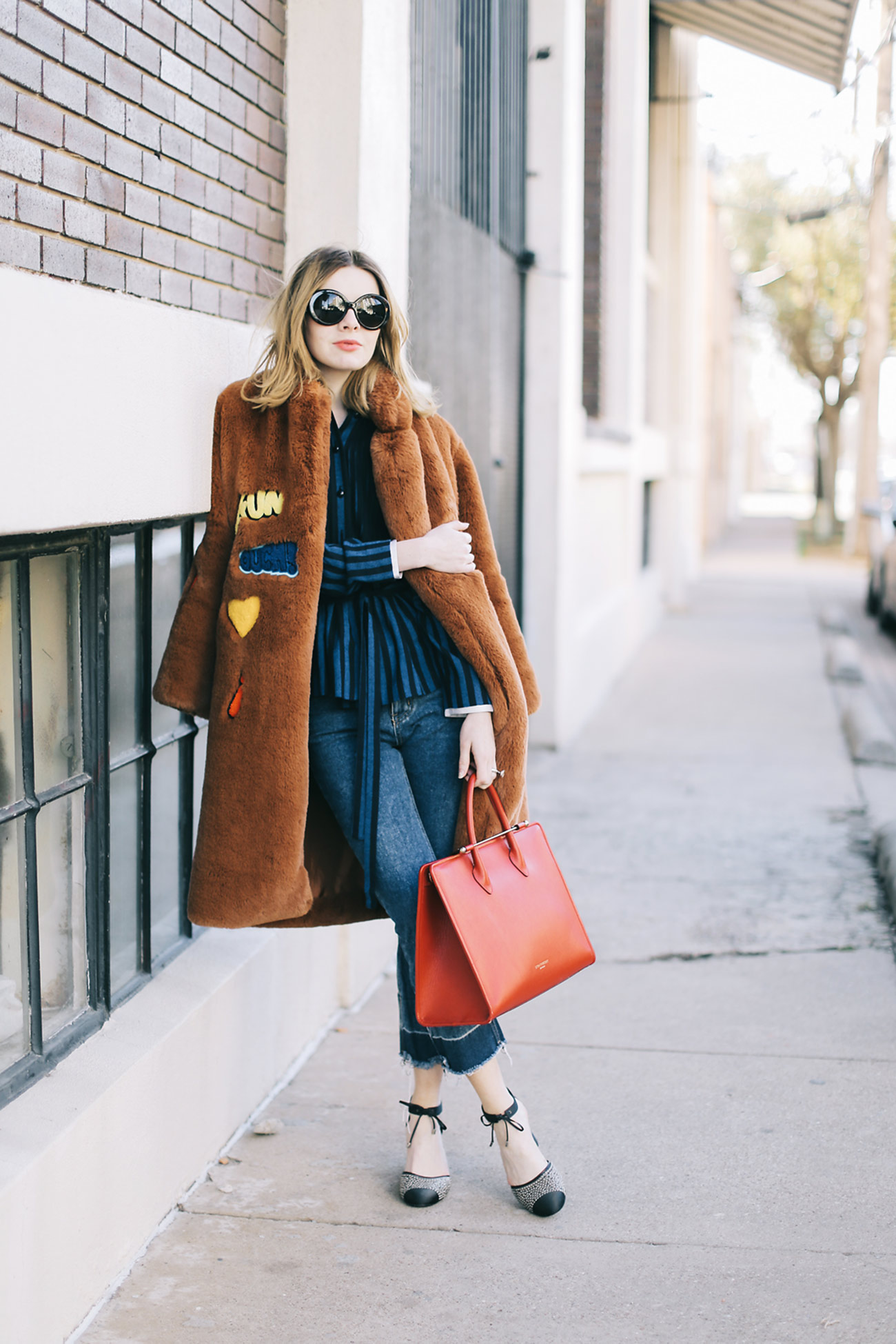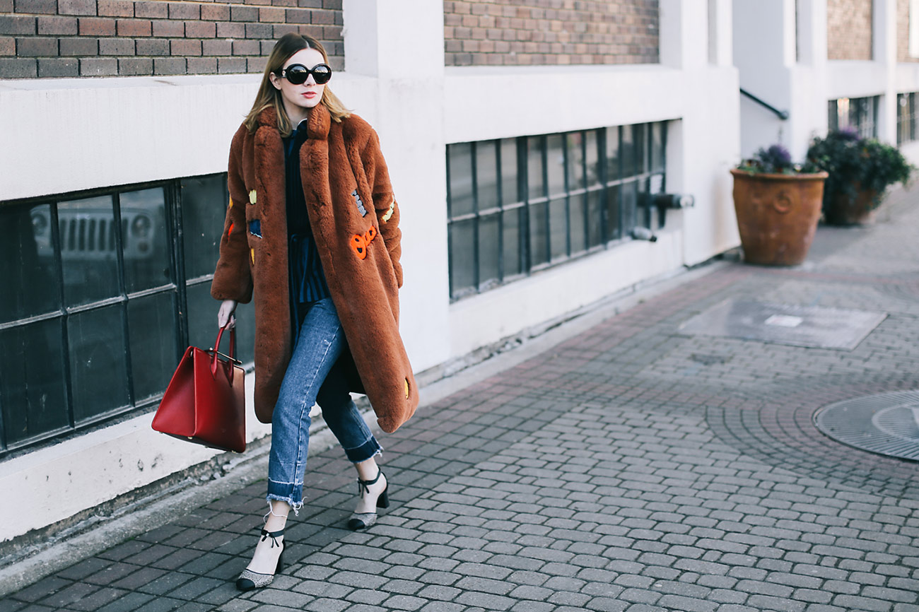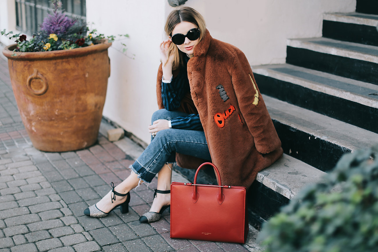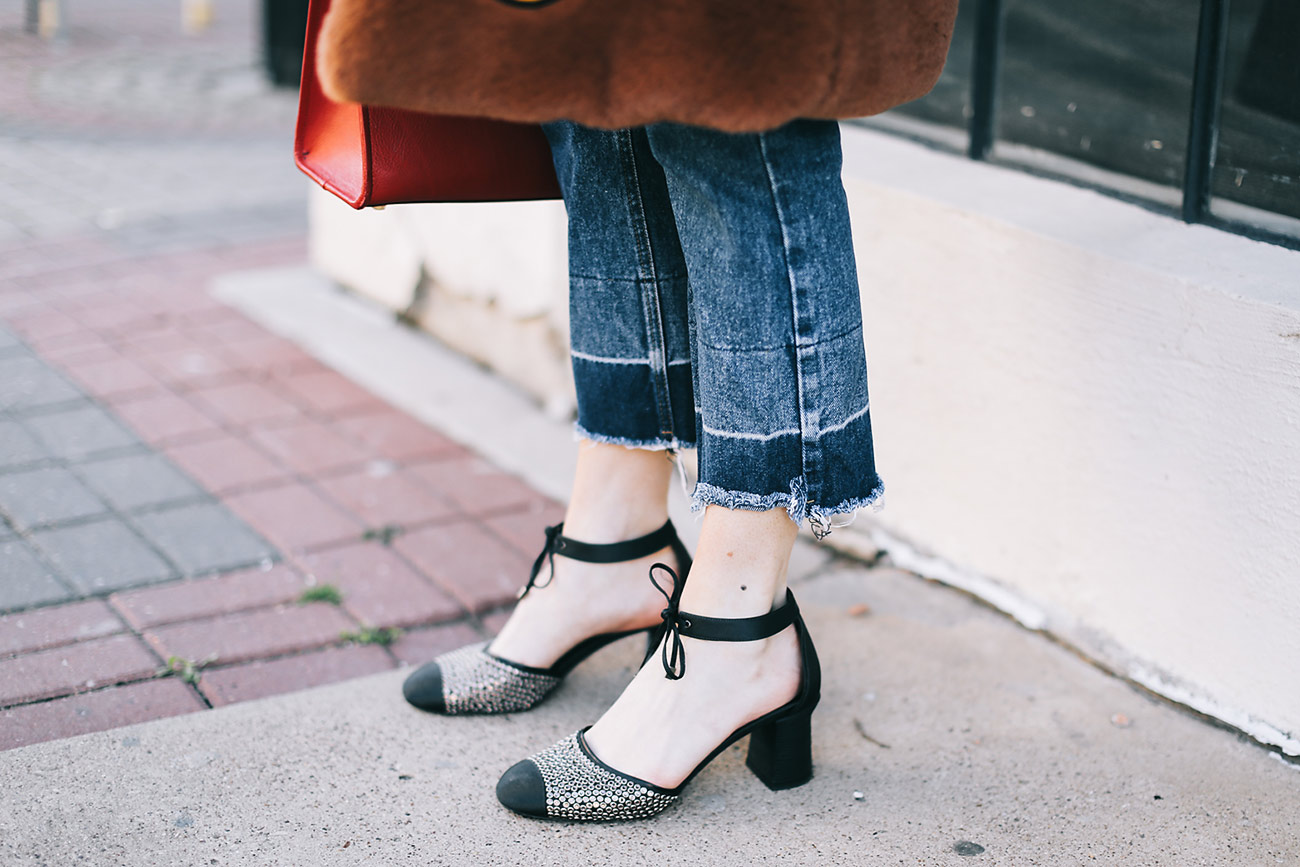 Wearing a StyleNanda faux fur from last year with cropped flare jeans, a Strathberry tote, Versace sunglasses, and Giorgio Armani ankle strap cap-toe pumps.