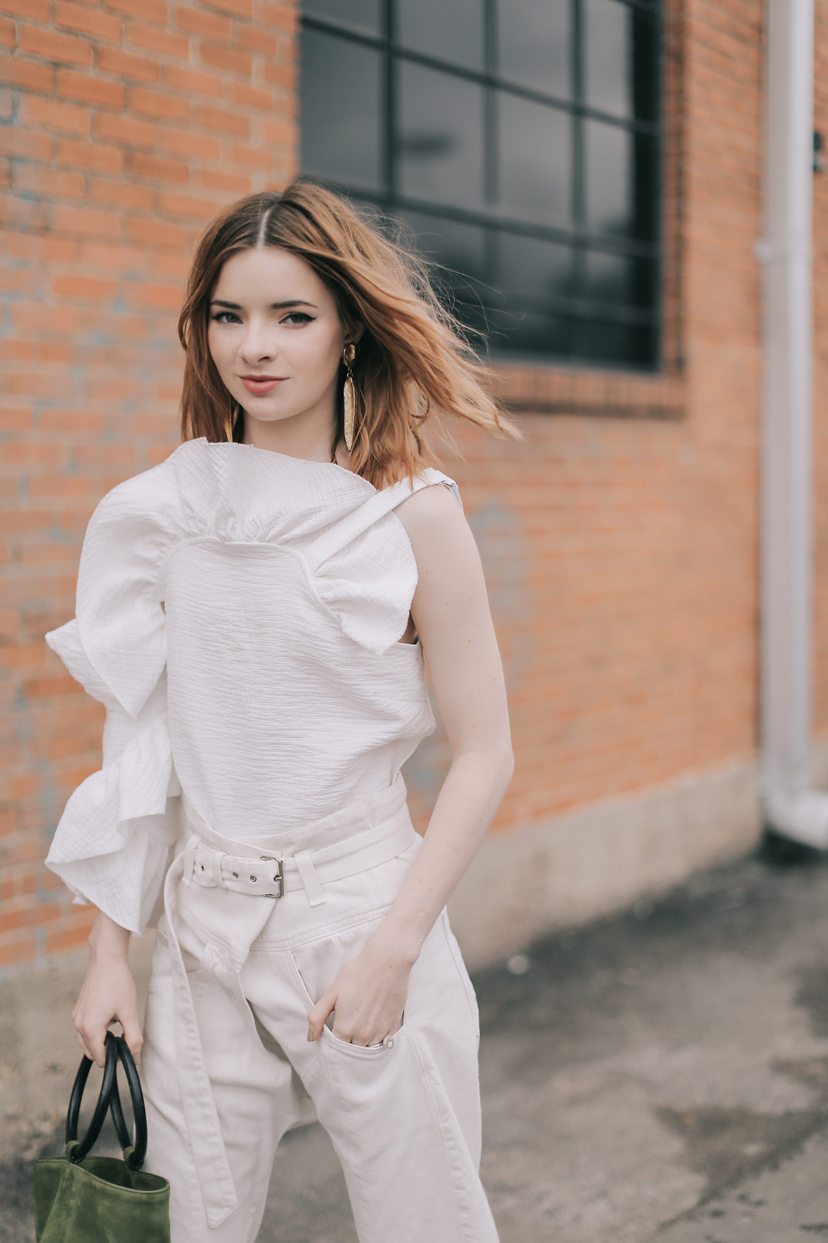Wearing Rachel Comey one shoulder cloque top, Rachel Comey wrap waist pants, Simon Miller bag, and Acne Studios patent stitched clogs.