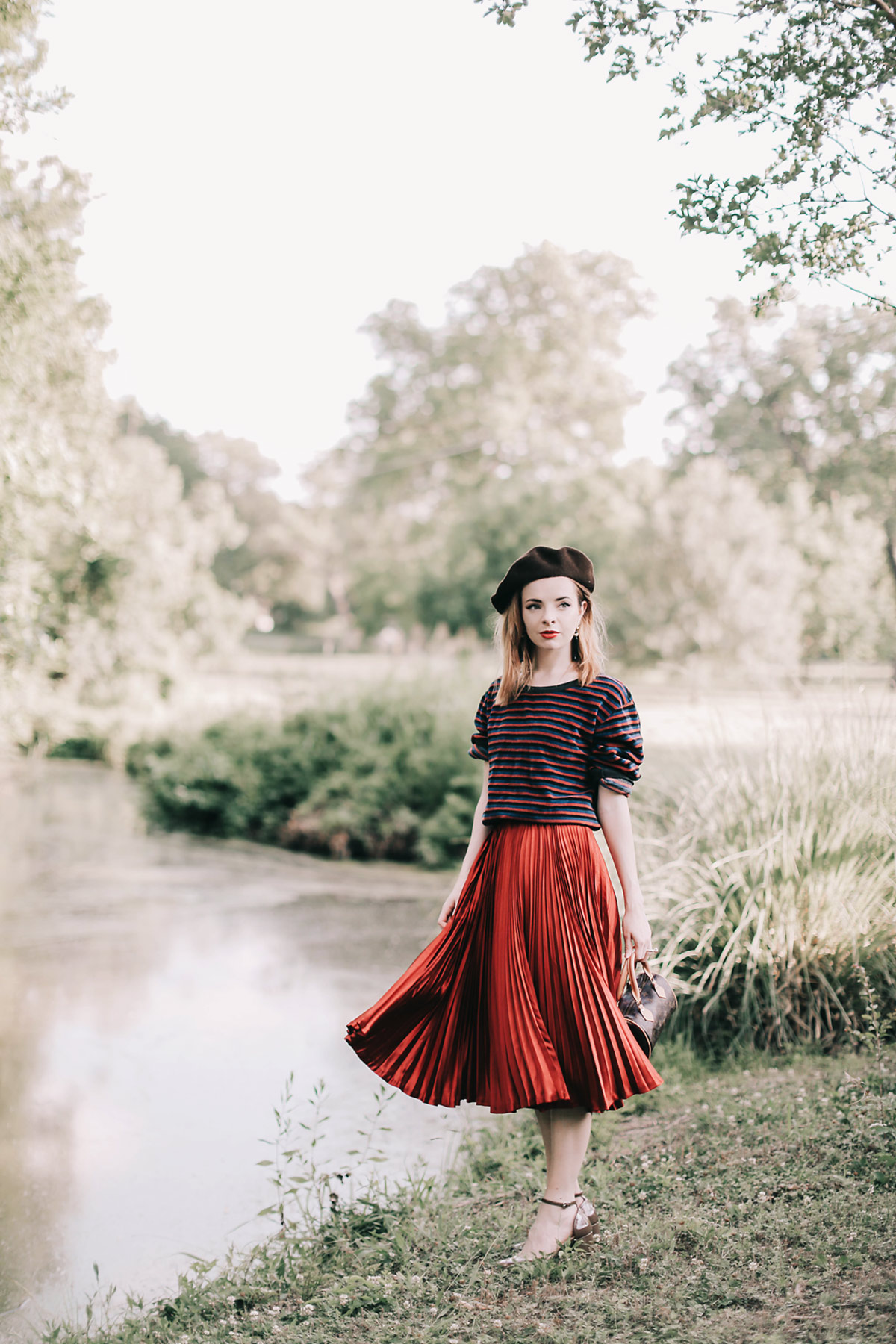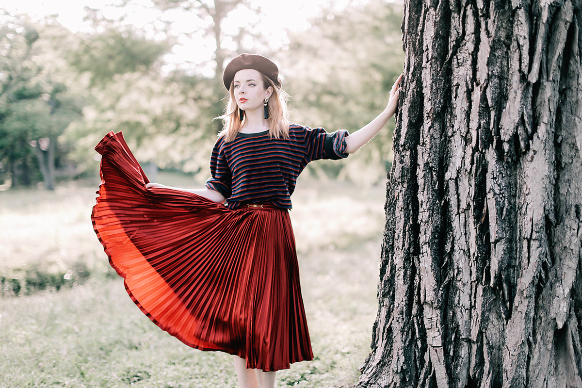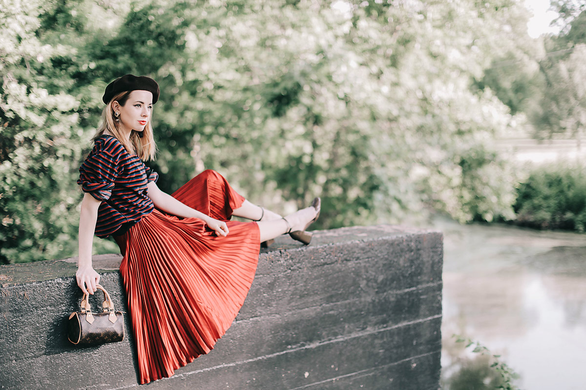 This is a look I put together with some recent vintage favorites. The skirt is 70s Celine and the top is vintage Sonia Rykiel. I’m a huge Sonia Rykiel fan and this outfit is definitely inspired by some of her signature looks. I love how she played with French classics in such a tongue-in-cheek way, and her use of disco-light shades of super saturated color. I added a beret and a tassel earrings just for fun with this. I’m not normally a fan of knife pleats but in the context of this skirt I love them, the shiny fabric makes the skirt play with the light in such a great way! Maybe I’ll have to change my mind about knife pleats now.