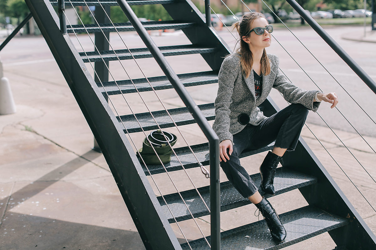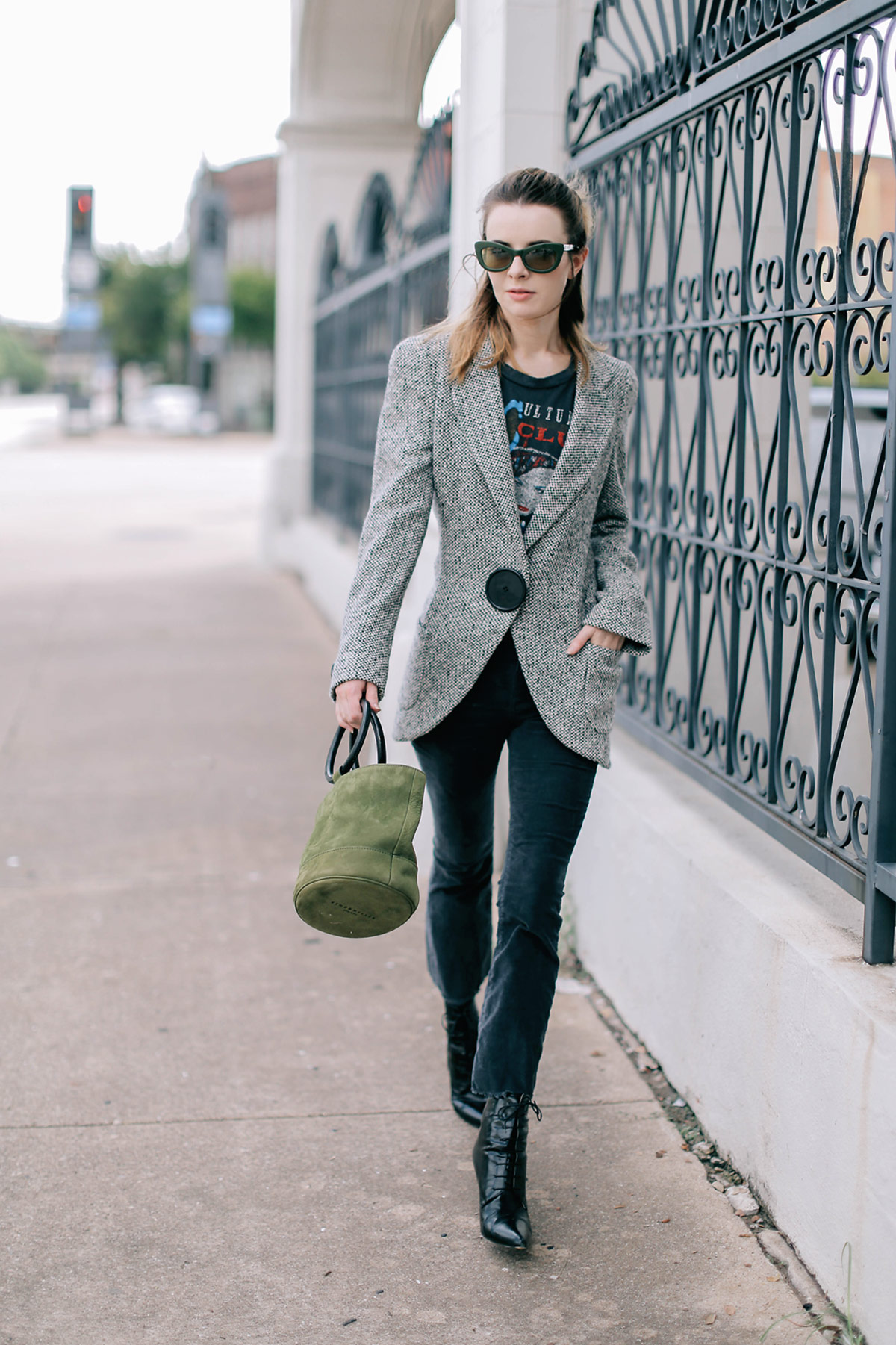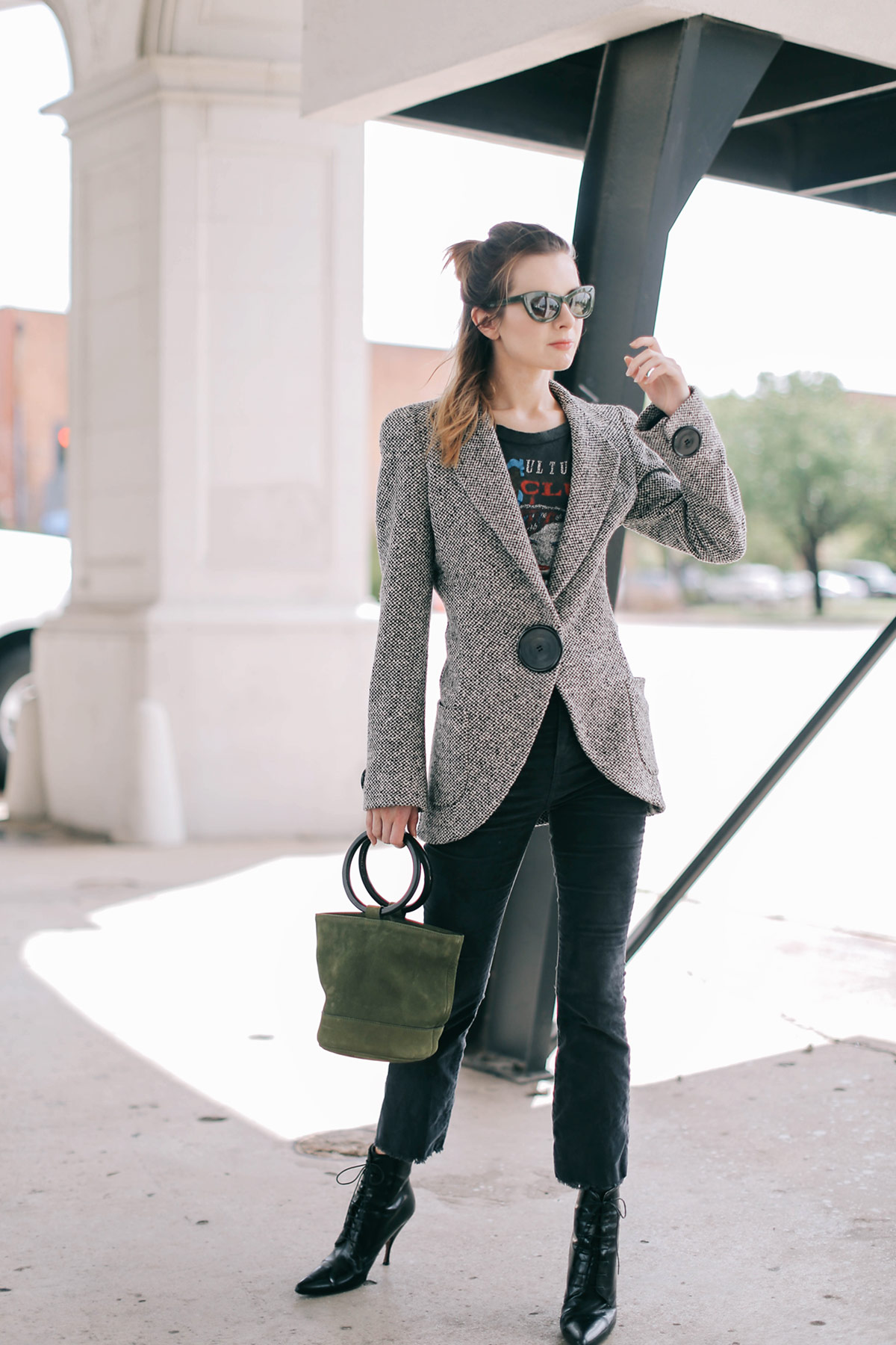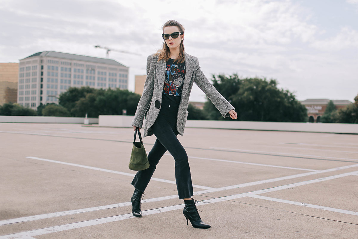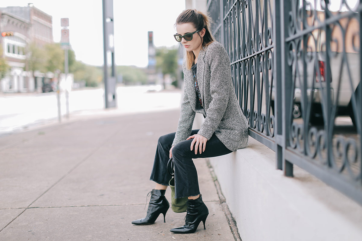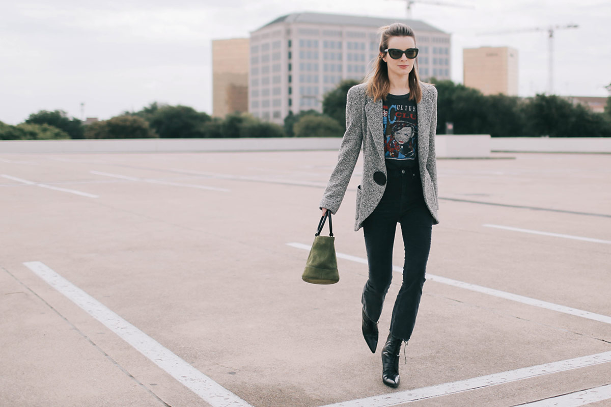 Wearing a vintage Culture Club tee with vintage 90s Ungaro cashmere herringbone blazer, cropped corduroy pants from Urban Outfitters, Simon Miller bag, and Rochas boots from several years ago.