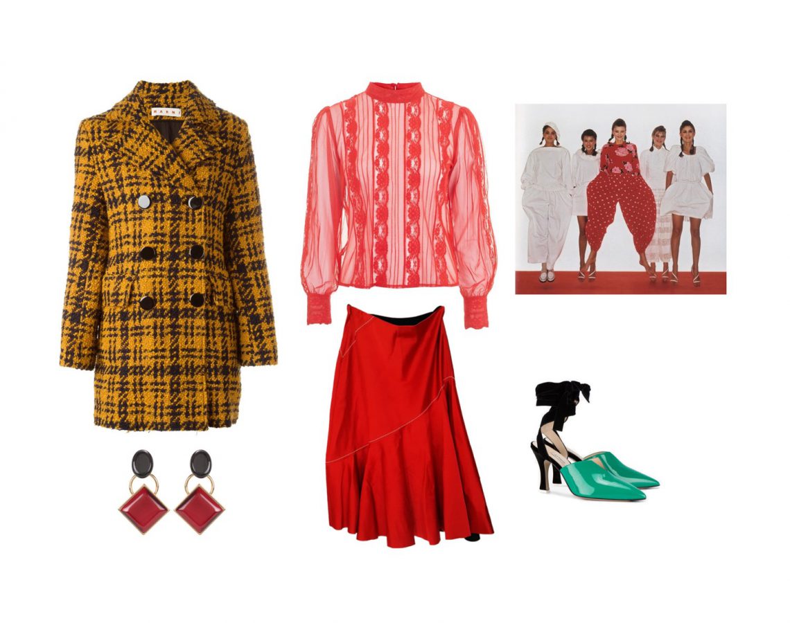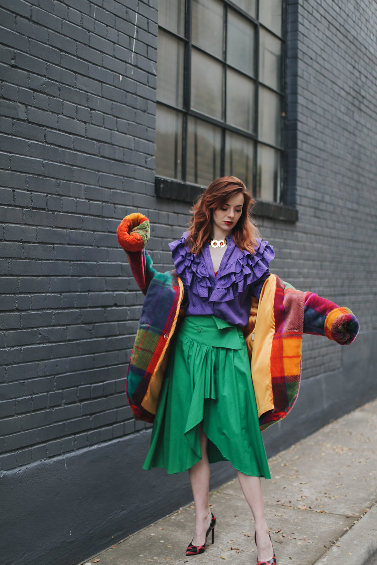I picked up this blouse from & Other Stories while in Paris. My eyes were immediately drawn to the color. Purple is one of my favorite colors to wear and I loved the ruffle bib front. While dreaming up color palettes I knew that this purple blouse would pair fantastically with a vibrant kelly green. I got this 80’s skirt from one of my favorite vintage sellers over the summer. The purple and green made for a fun pairing. A red lace bra from Agent Provocateur was a cheeky way to bring in some more color.