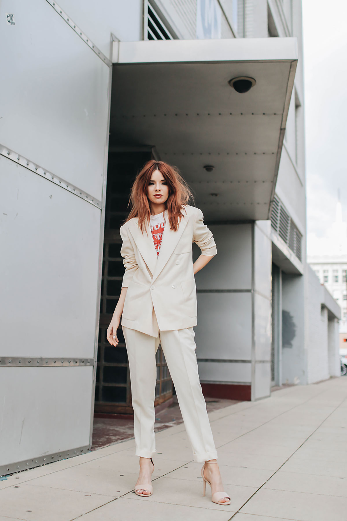 I love the cream suit and t-shirt combination!