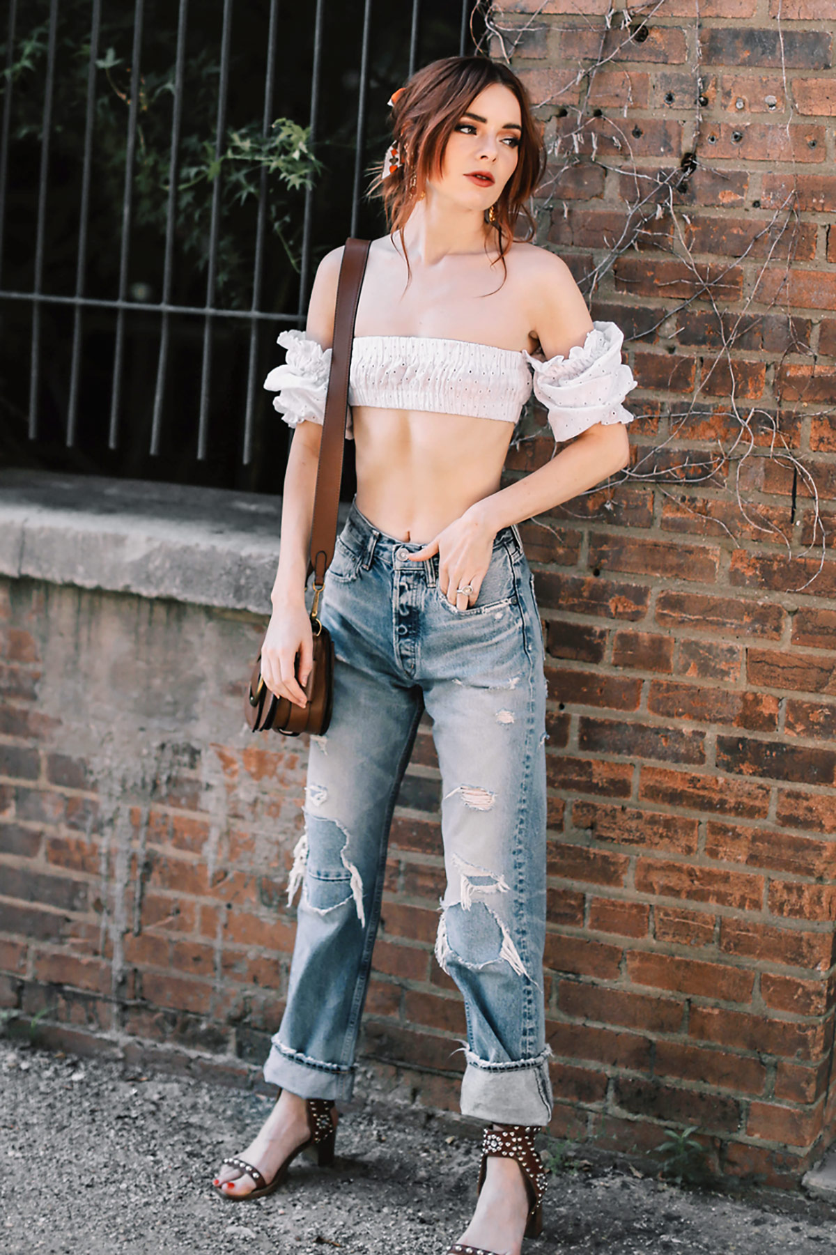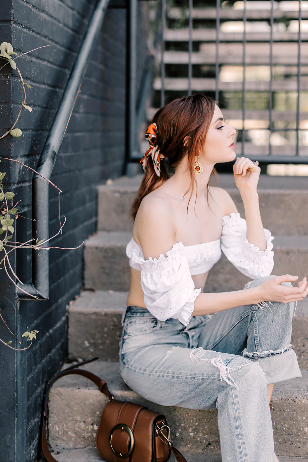 A pair of super-high waisted, almost 40s workwear inspired jeans is one of my current favorite ways to pair crop tops. It keeps the look somewhat tomboyish and the tummy-holding high rise jeans ensure you feel comfortable wearing these out in public. I got this pair of Moussy’s a while ago, which I’ve mentioned before is my current go-to brand for jeans of all styles. Here I am wearing those jeans with an off-shoulder bandeau top by AreYouAmI. This kind of summer weekend look is really good with a messy laidback hairstyle accessorized with a scarf and some vintage earrings.