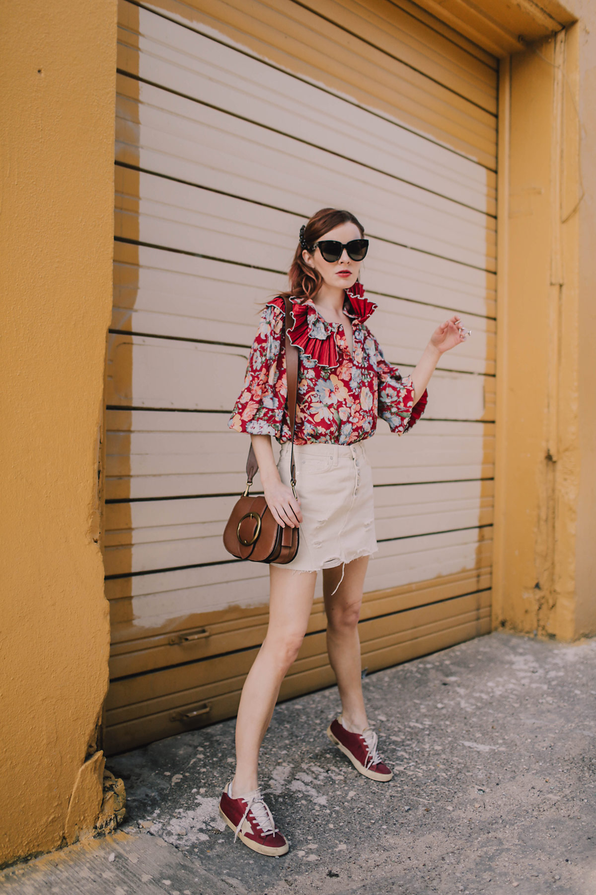 Wow! Every detail of this outfit looks incredible! You are so inspiring lady, as you ideally team every item in your wardrobe. I like the way you pair that sweet floral print blouse with mini denim skirt and matching color kicks. The tortoise sunnies are incredible! A very nice style for summer days!