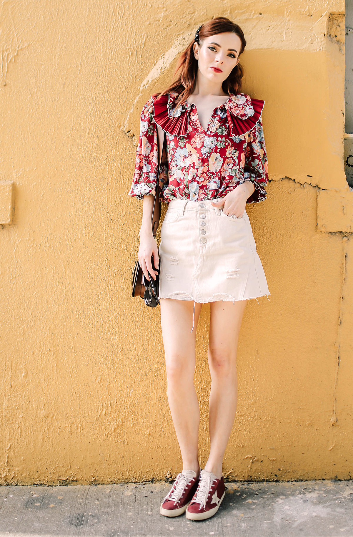 I’ve been craving a white denim miniskirt for easy summer outfits and I finally got this one at Free People. When it’s scorching hot outside and you’ve got a bit of tan going on, nothing could be more appropriate and simple to style. With a band tee and a fun pair of pumps for a concert, or with leather sandals and a tank top for a weekend off. I wore mine with this vintage Jeanne Marc blouse and a big 70s barrette. Worn with Le Specs sunglasses, Golden Goose sneakers, and a Polo Ralph Lauren bag.