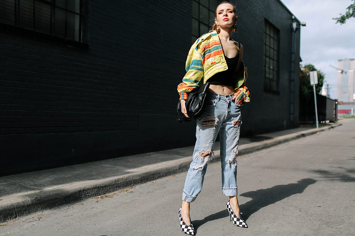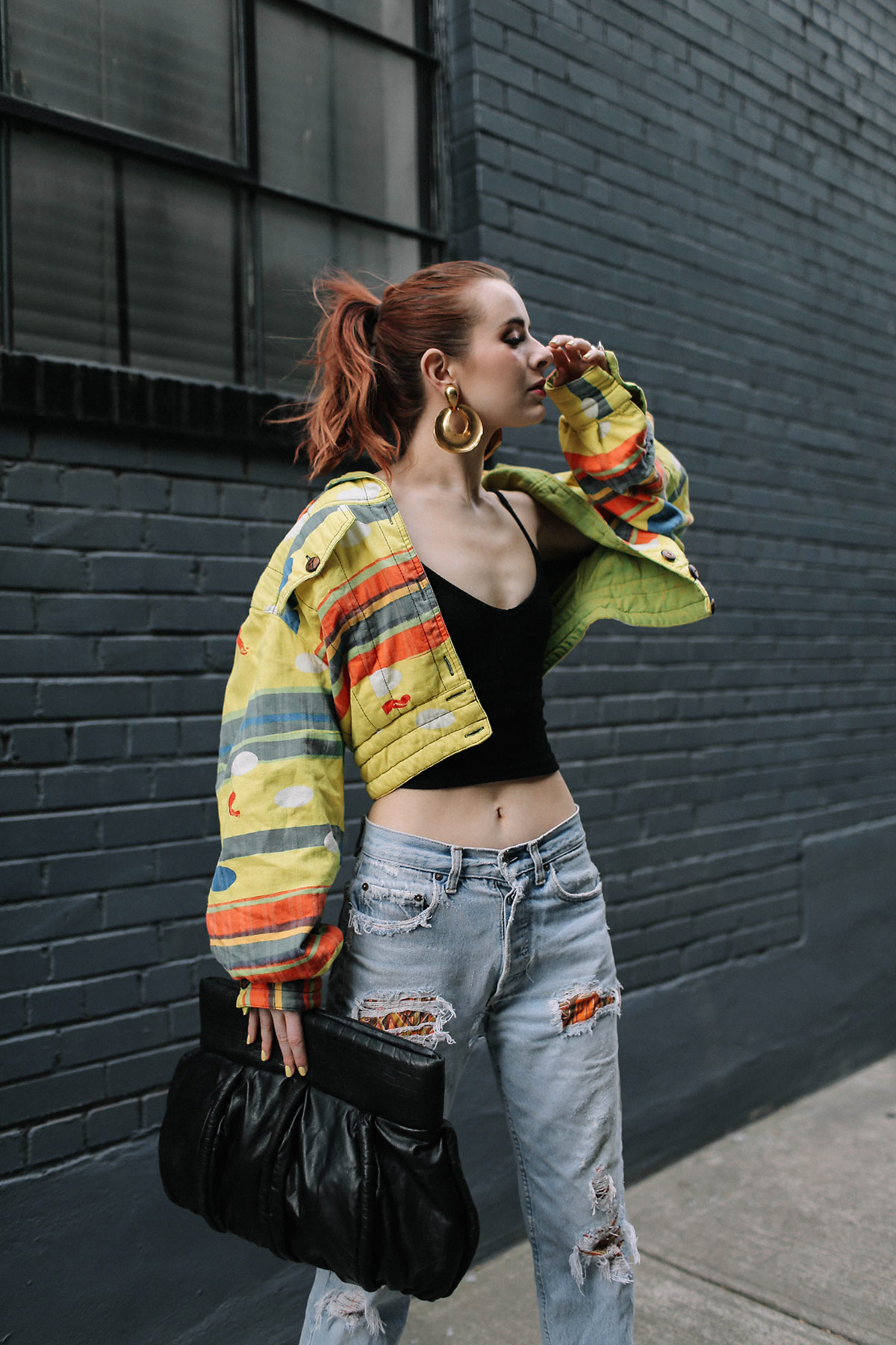 This weekend we had my family over for dinner, and my mom always seems to come bearing gifts. Can anyone relate?? I am not complaining, she is very thoughtful to do so. This amazing 80s jacket I am wearing was one of her finds! Thank you Mom, I totally love it. What fun to style! The jacket is vintage, as are the jeans, earrings, and the clutch. The shoes are Stella McCartney from last year and the tank top is ASOS.