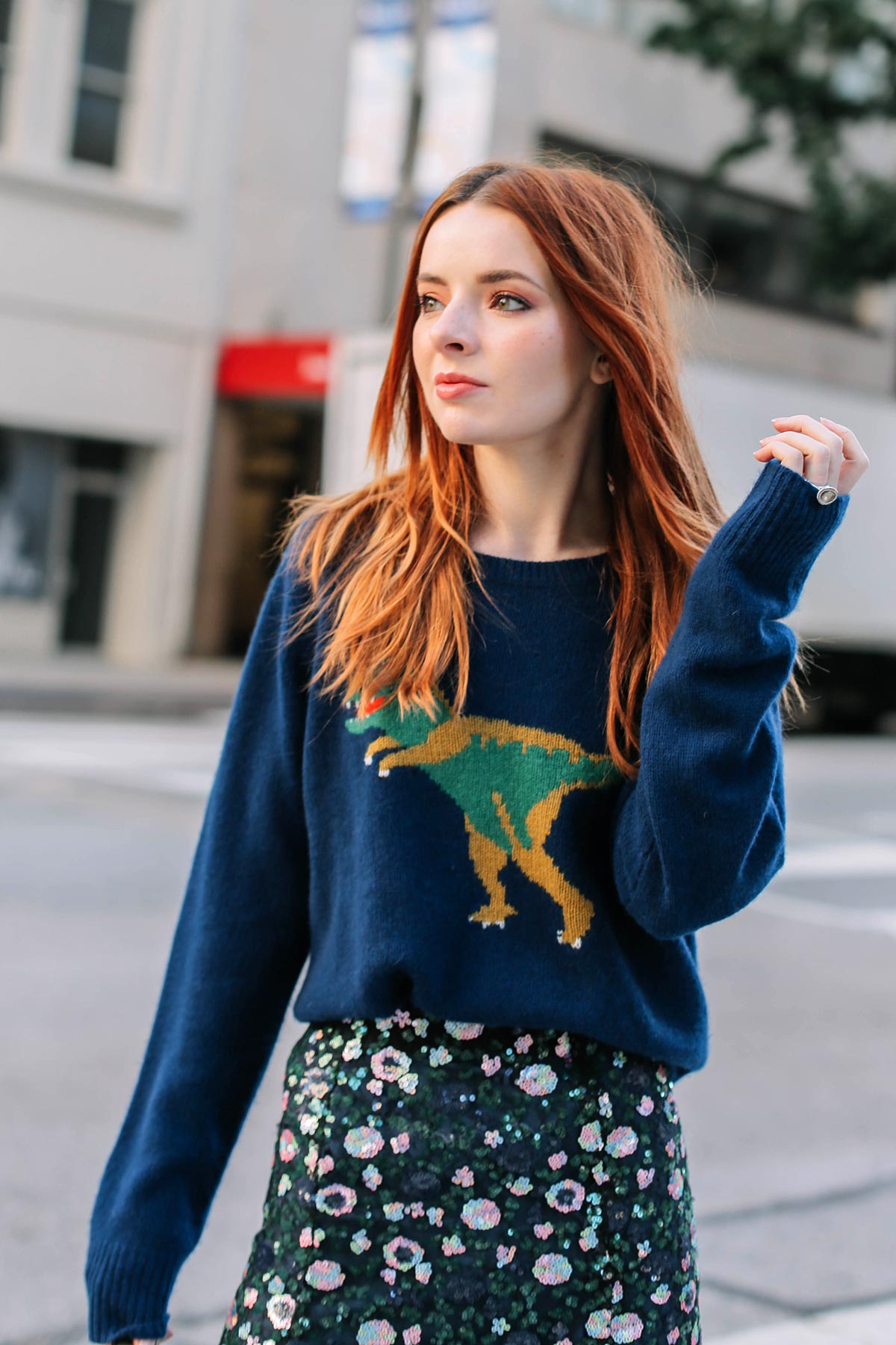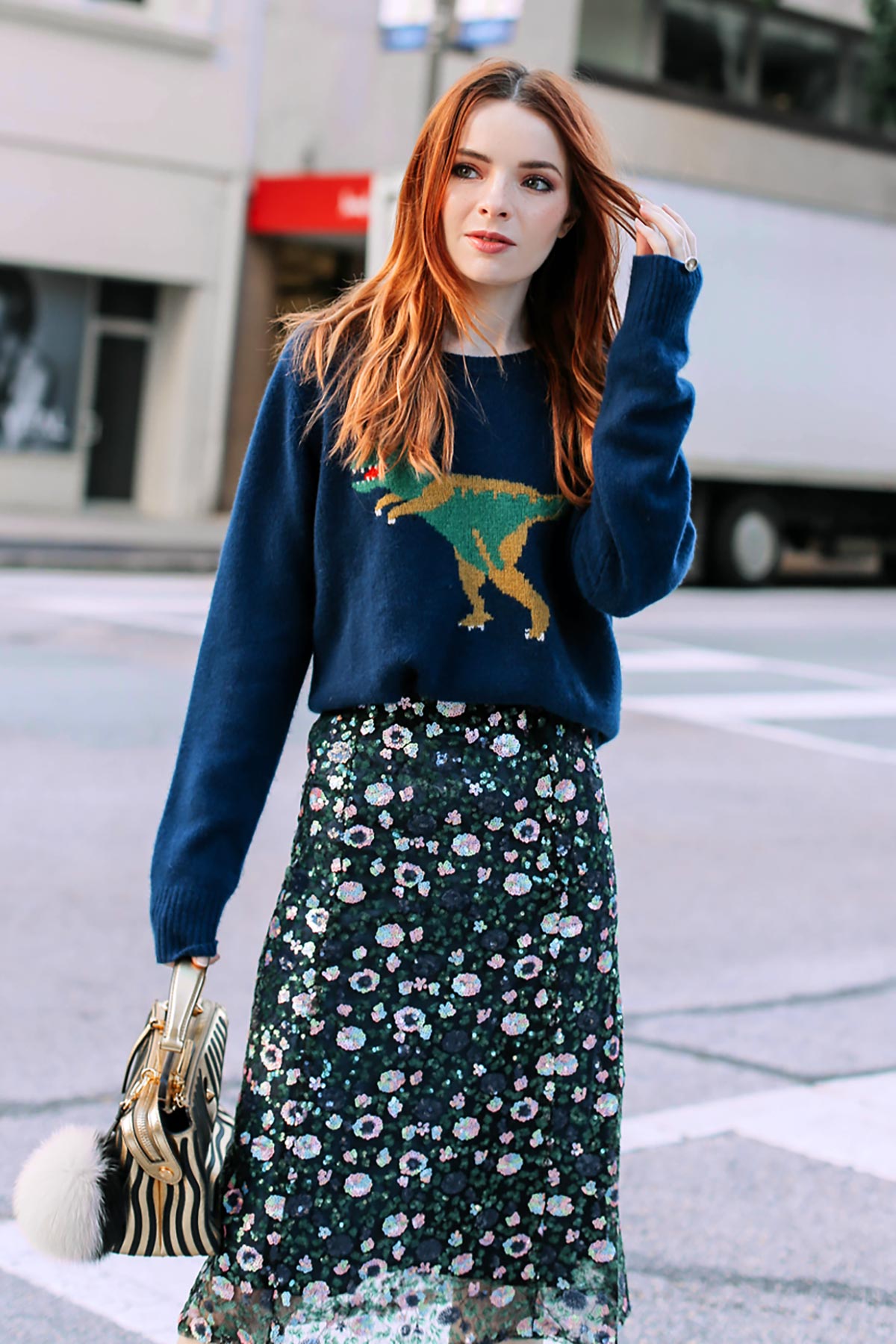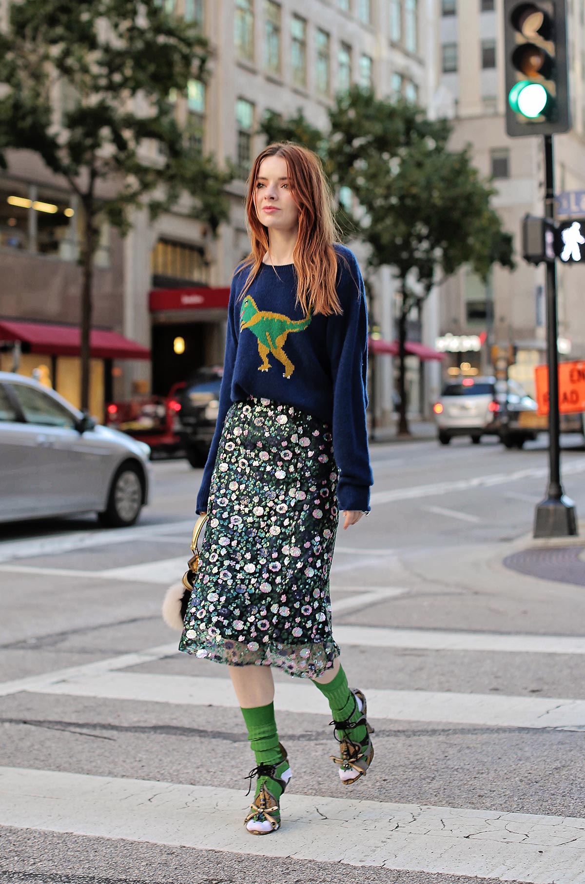 Wearing Coach dinosaur sweater with Stylenanda sequin skirt (from several years ago), Miu Miu dragonfly shoes with green ribbed socks by Happy Socks, and a Fendi Dotcom bag.