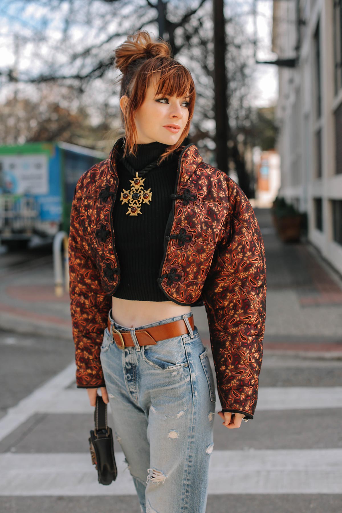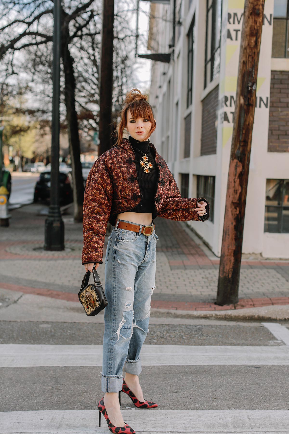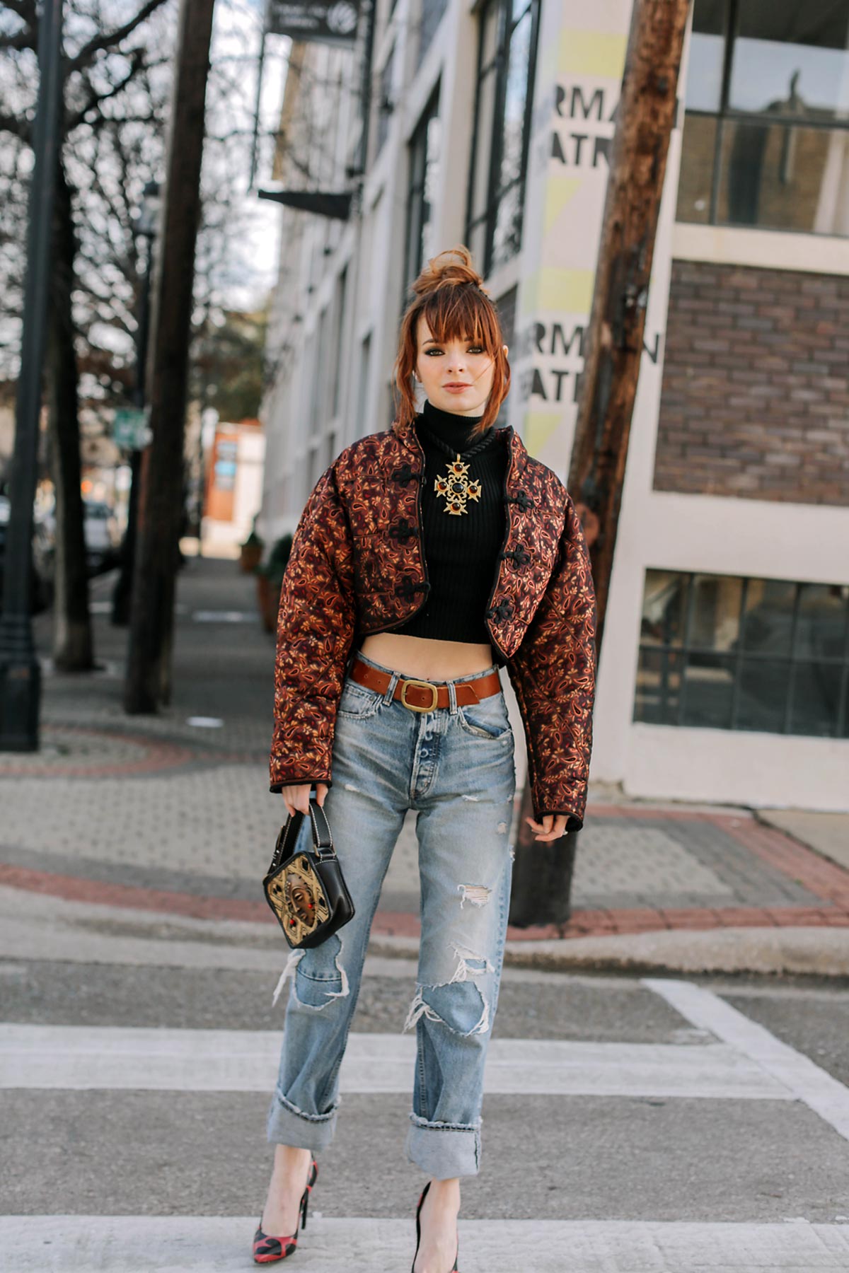 I’m wearing a vintage 80’s ski jacket by Bernard Perris with a cropped turtleneck, Moussy jeans, and Saint Laurent pumps.