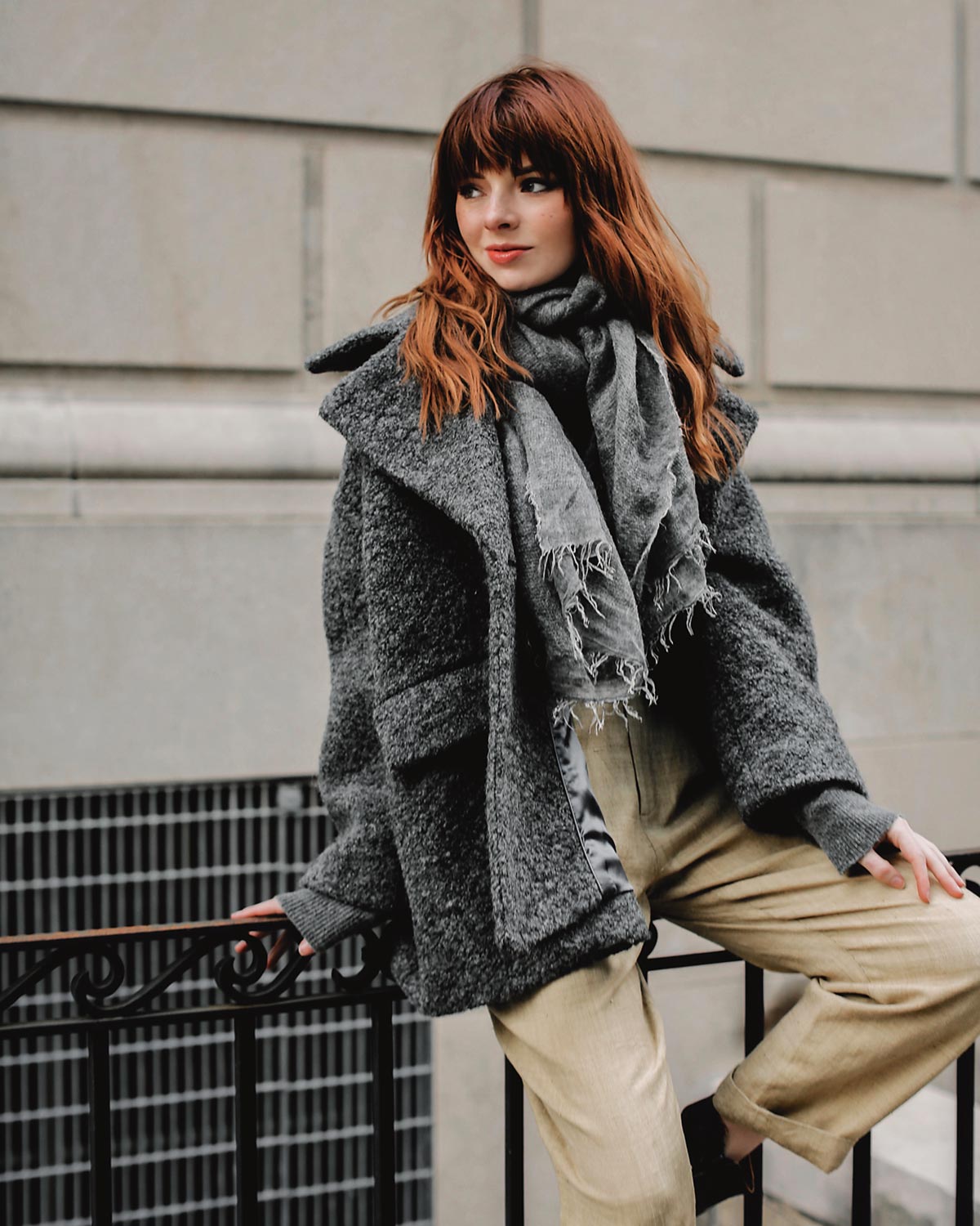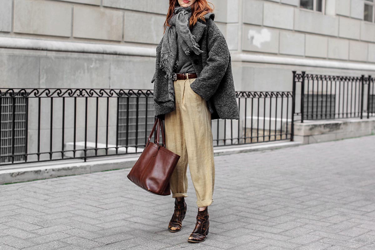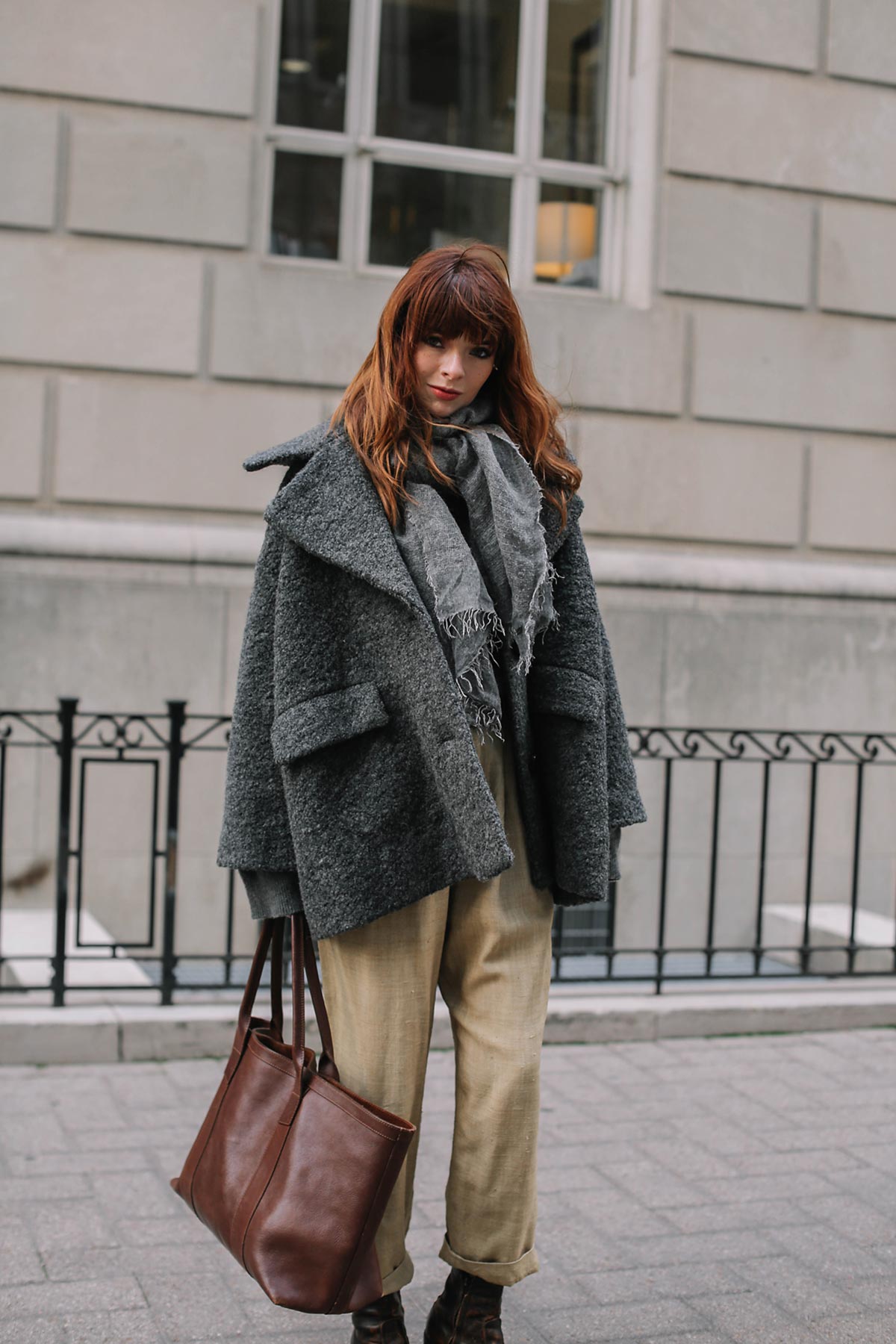 Wearing Ganni grey coat, gauze grey scarf from Barneys, vintage Yves Saint Laurent pants, a thrifted cashmere men’s v neck sweater, boots I got at a flea market, and Lotuff’s working leather tote.