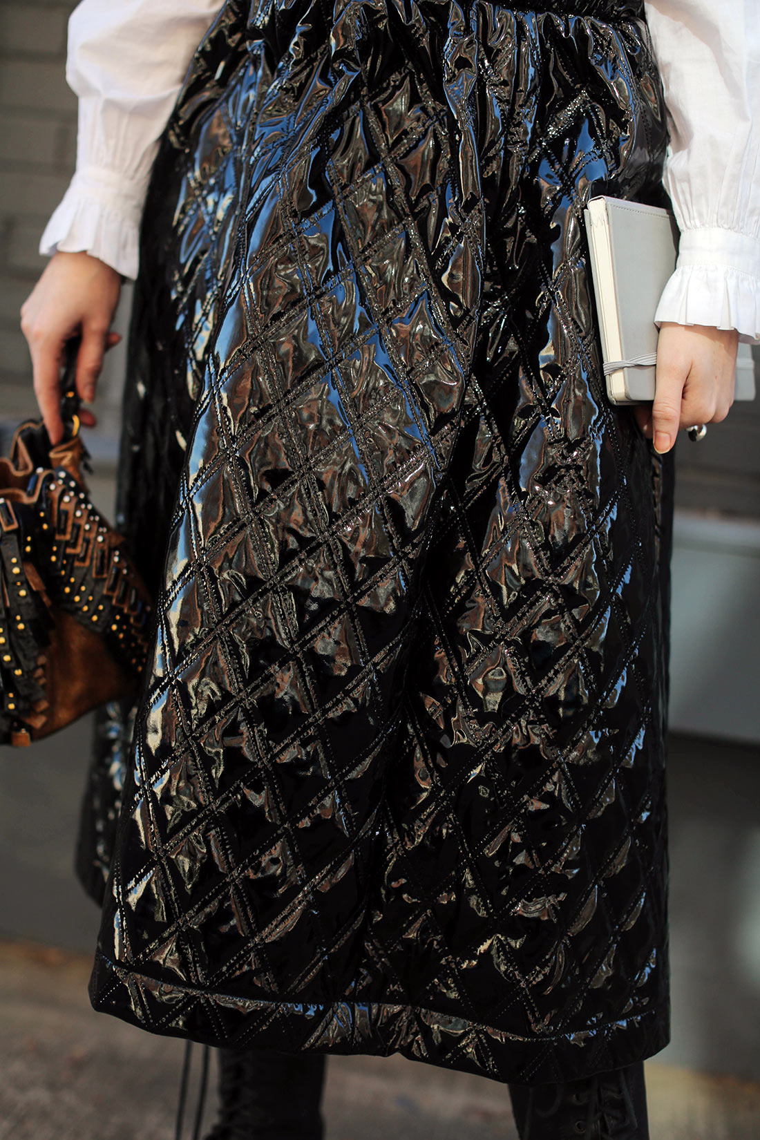 Luckily for me, a lot of good Noir Kei Ninomiya went on sale this season. This plastic-y faux leather apron dress was one, and I am totally confident that this is a piece of clothing I will be wearing and enjoying immensely for many years to come. You really can’t believe how comfortable this dress is. It is genius design. The quilted pleather gives this apron so much structure and body, a deeply satisfying thing to feel against your body. It is a resilient piece of armor that somehow manages to be comfortable and easy. I can pop this apron dress over a Laura Ashley blouse like I did here, or I could wear it with fuzzy slippers and a punk rock tee to go get groceries.
