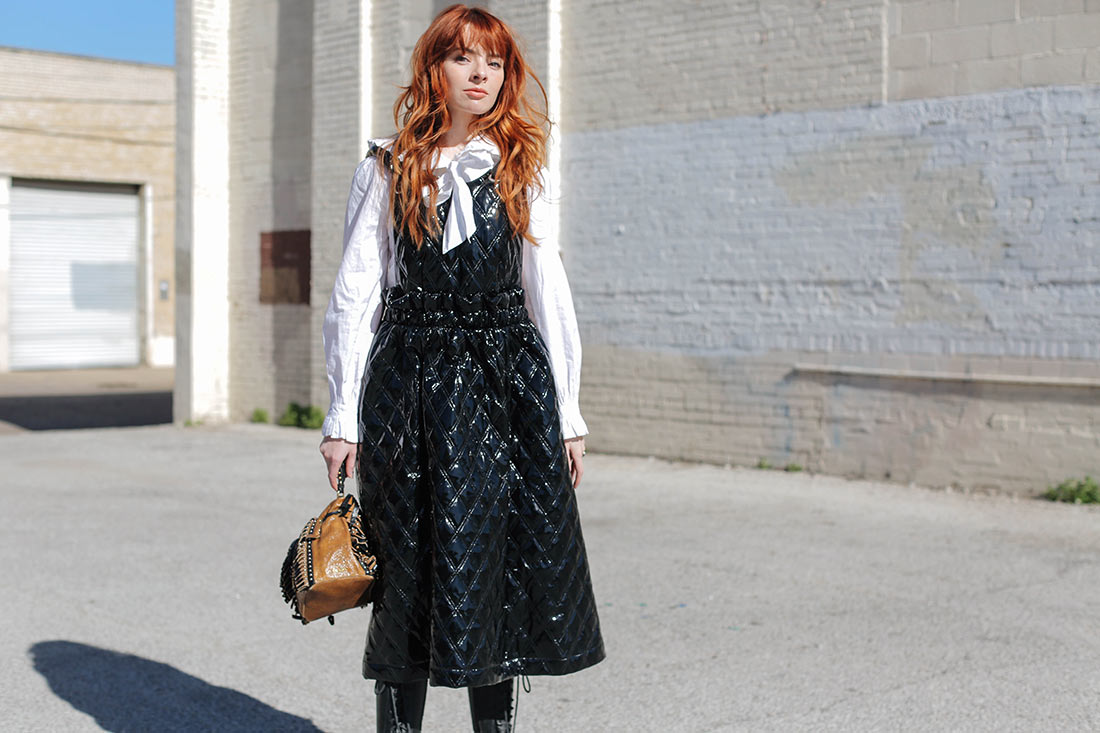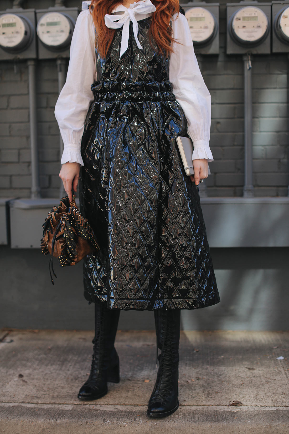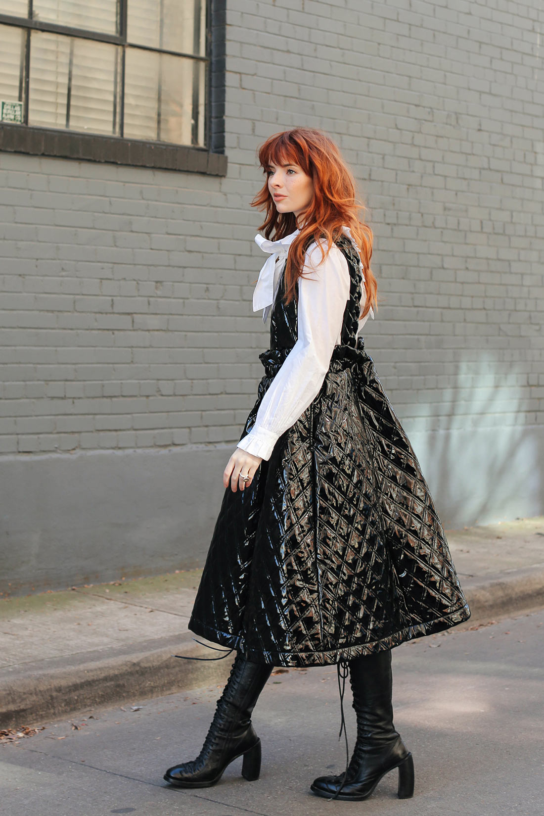 Wearing Noir Kei Ninomiya faux leather apron dress with a vintage Laura Ashley blouse, Prada bag, and Ann Demeulemeester boots.