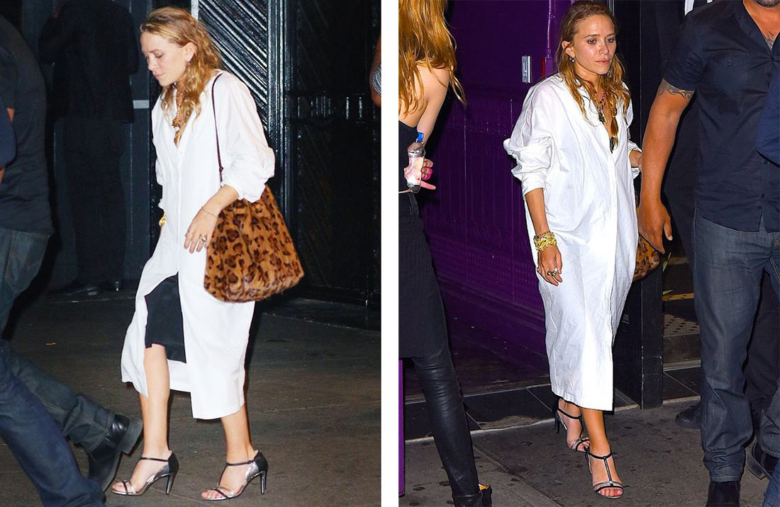 This 2016 MK look ticks my boxes for a several reasons. The way the lengths are being played with in this look is totally genius. The oversized shirtdress and beachy hair say I just got back from a private beach and haven’t even unpacked, so I’m throwing on my coverup with a Rick Owens Lilies skirt and a mink leopard bag and calling it a look. There is something very chic about eschewing any hint of a waist and just letting your outfit take up more space in the world. I couldn’t tell from the first photo but in the one on the right, we can see she is absolutely dripping in gold jewelry. Not taking your time to comb your hair or put on makeup, but actually taking the time to put on all of your biggest rings and necklaces is the kind of rumpled glamour Olsen fans can’t get enough of. I also love the bag, and I love the way the Olsens often choose normal designer bags and in favor of no-name bags in exotic furs and skins. It’s much more chic.
