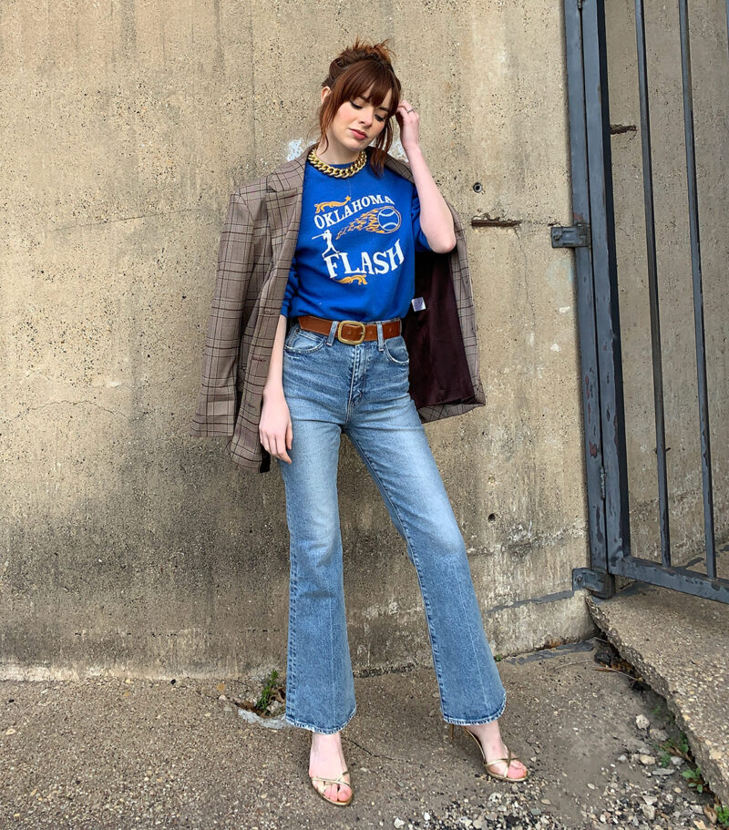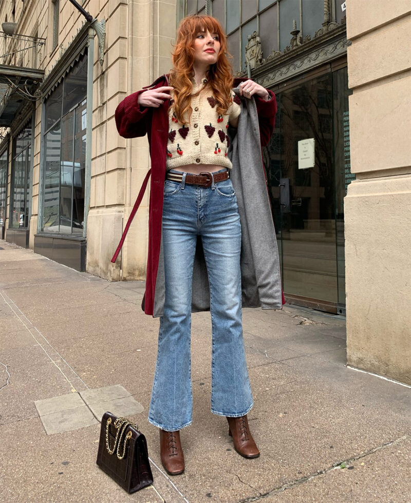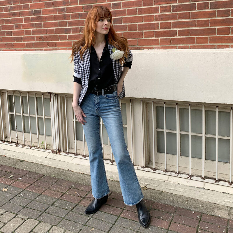 I went to the Moussy boutique in Soho two years ago and found my dream jeans: The Moussy Luna Straight Flare. The high-rise hugs my midsection comfortably and the slight flare in the leg looks great with about every kind of shoe I own. I’ve posted many looks wearing these jeans, below are a few example of me in my Moussy Luna flares. They’ve served me well since the day I bought them and work well with my daily uniform of sweatshirts and western boots. Here is a word to the wise: Japanese denim tends to be sized for a more petite market. I went one size up in these jeans, and I’m 5″6. My sister is 5″9 and goes up two sizes in Moussy.