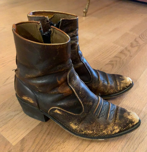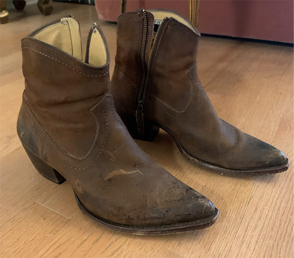 These Frye Sacha boots pictured above have that same great shape and western pointed toe, and the glossy finish would chip away with age, like the vintage boots above. All it takes is wearing them to shreds for a few years. I myself have another pair of Frye boots, pictured below, that I have worn in over the last few years and they’ve aged nicely.