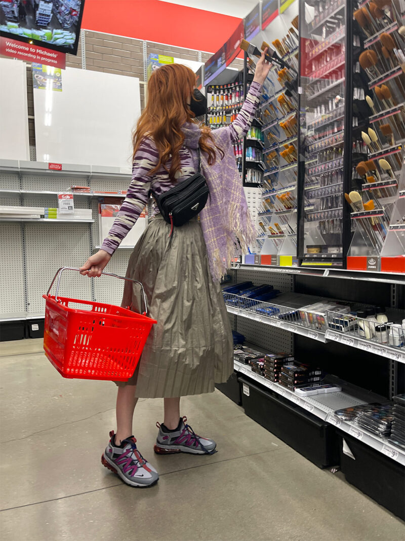 The much-talked about Adidas skirt strikes again! I wore the clay-colored Adidas skirt on this trip to Michael’s with a purple zebra Givenchy Sport v-neck sweater, a 60’s mohair lavender plaid stole, a Prada belt-bag, and Nike Air Max Bowfin sneakers. I got the Givenchy Sport sweater a few years ago from Feather’s Vintage in Austin, Texas. The lavender mohair stole is part of a two-piece set with a matching skirt I got at Vintage Martini last year. I recommend searching “mohair stole” on Etsy and eBay, it pulls a ton of gorgeousness up. These chunky stoles look great with so many different things.