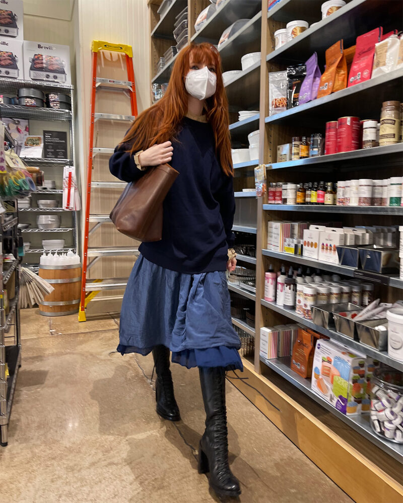 Anyone familiar with the legendary Soho boutique If will recognize the name Ivan Grundahl. If Boutique has carried the Danish designer for many years and if you cruise If’s famous basement sale you will find TONS of seriously marked down Ivan Grundahl. If you ever get the chance in life, you must go look at the If Boutique basment sale. It happens twice a year and it’s some of the best shopping and people-watching you’ll experience in your life. The skirt I’m wearing above is by Ivan Grundahl and I have a matching wrap jacket that goes with it, but here I am wearing it with a Stylenanda sweatshirt instead. And yes, I am wearing a petticoat under the Ivan Grundahl skirt. They really do come in handy!