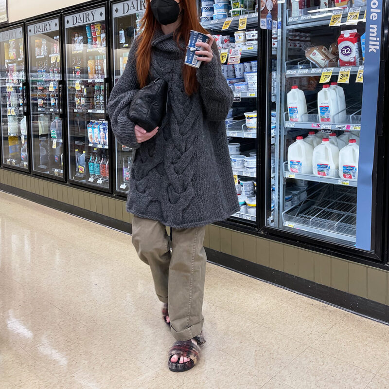 So these pants are RRL fisherman pants I bought at the Soho RRL boutique a very long time ago. I am obssesed with taupe and this baggy silhouette for pants, so I’ve worn them a lot lately. The sweater is Ivan Grundahl (again!) and I bought this two years ago at the If Soho Boutique basement sale. I love it! The mohair sandals I’m wearing are from the very last Phoebe Philo collection for Celine. They’re very hairy and I’m so glad I bought them. Again, I am carrying the old Proenza Schouler stitch-embroidered clutch.