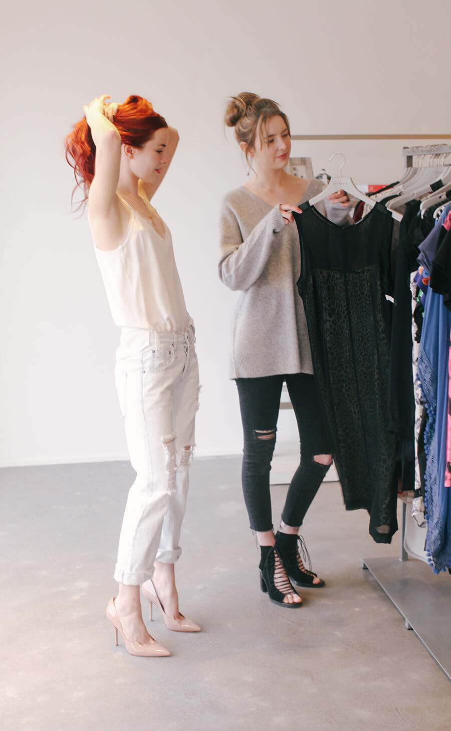 Wearing an Anine Bing cami and Calvin Rucker jeans from Elements boutique. Carol is wearing earrings by Jacquie Aiche.