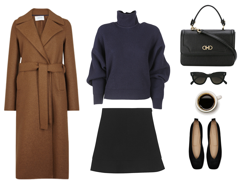 Trench Coat Turtleneck Mini skirt Ferragamo Bag Square ballet flats Celine Sunglasses Image HTML map generator