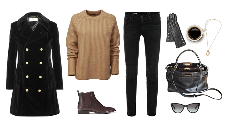 Military Coat Camel Sweater Chelsea Boots Black skinny jeans Fendi bag Sunglasses Gloves Pendant necklace Image HTML map generator