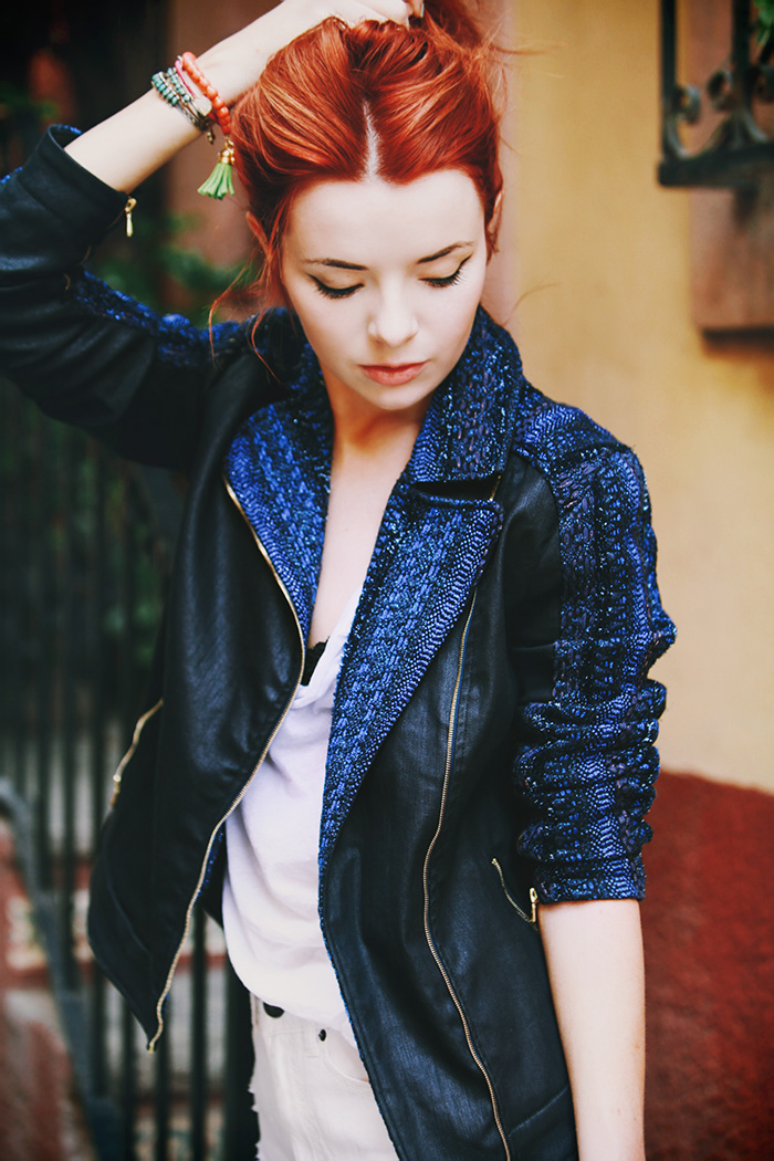 It was really fun to shoot this blue jacket against the gorgeous vibrant walls of San Miguel de Allende. This motorcycle jacket is part of the limited edition Malhia Kent For All Mankind collaboration. We wandered around the city forever exploring the narrow streets…as you can see I even picked up a new pair of shoes along the way. Haha!