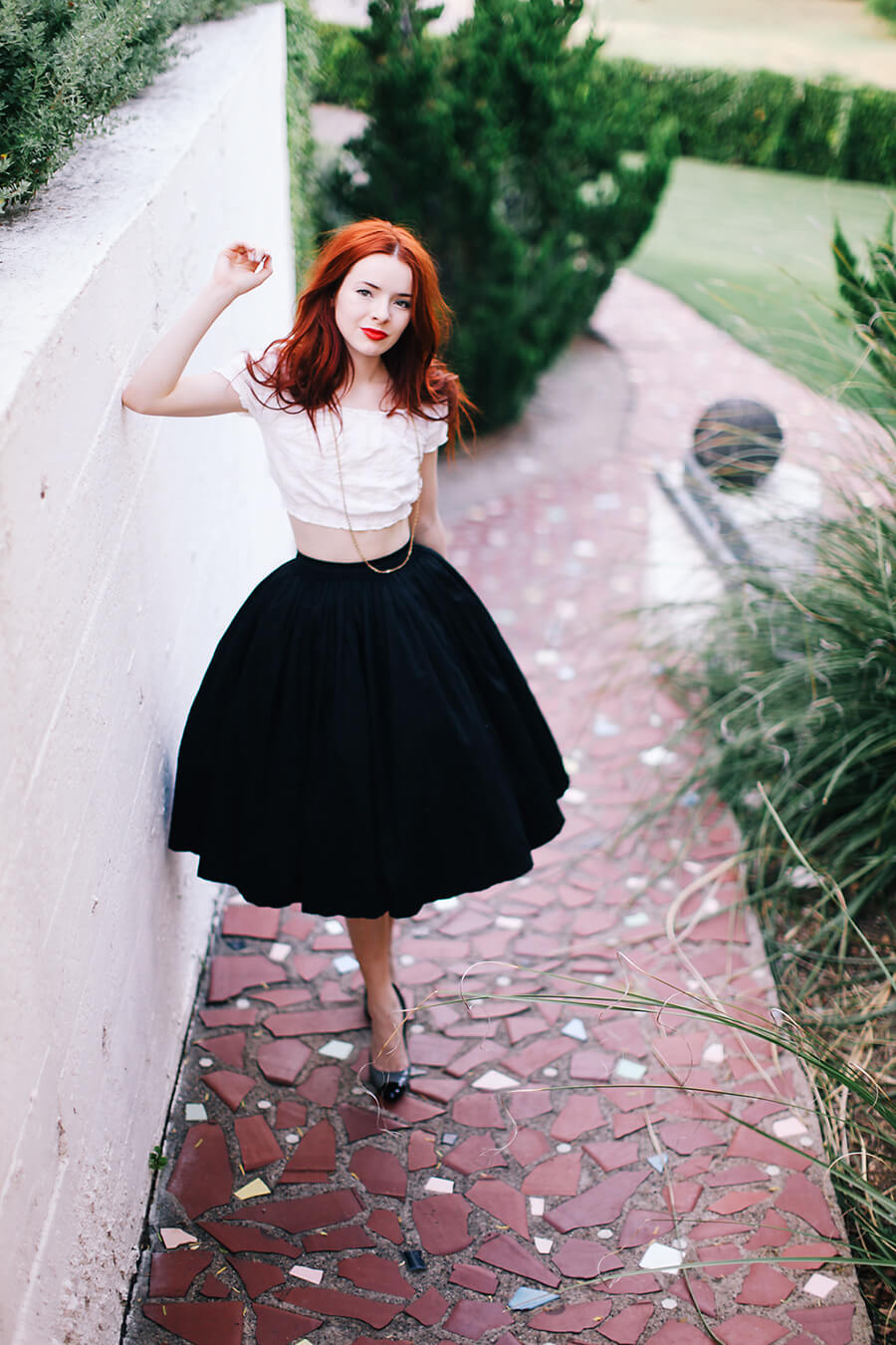 I love a good staycation, and I’ve been fascinated by the super retro Belmont Hotel here in Oak Cliff since it reopened. It was a motor court hotel built in 1946 by Charles Dilbeck. I love the sprawling Spanish style buildings and southwestern interiors, it definitely feels like an old movie set! The ambiance inspired me to pack tons of vintage, including my 50s silk slips, full skirts and petticoats, and dramatic 40s inspired nippy flared jackets. The Victor Costa jacket I am wearing above is an “80s does 40s” piece that I am crazy about! We shot these pieces with an array of delicate gold from LoveGold, who always seem to uncover the best of new jewelry talent. My favorite staycation activity is enjoying wine in bed with a good movie. I chose Leave Her to Heaven (1945, with beautiful Gene Tierney). One of my all time favorites, I highly recommend it for your next old movie night!