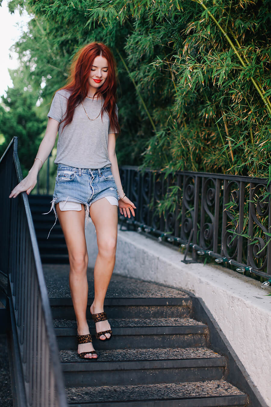 Wearing Three Dots ‘Grae’ tee with gold Hoorsenbuhs necklace, vintage cut-offs and Miu Miu leopard heels.
