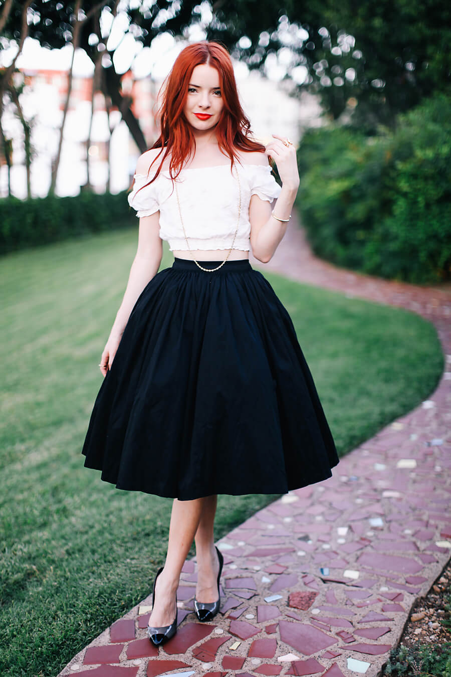 Wearing gold Elena Votsi bangle and gold Hoorsenbuhs ring and chain necklace with an H&M cropped blouse, vintage skirt, and Sergio Rossi heels.