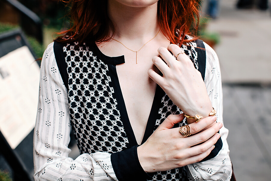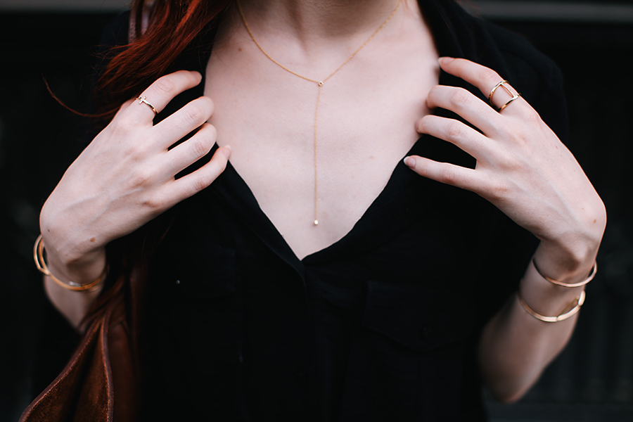 I just got back from New York and it was hard for me to leave. Fall has begun there! There’s a chill in the air and come late afternoon the city is bathed in beautiful golden autumnal light. I was there for meetings and the Ralph Lauren show. Packing for fashion week can be so nerve-wracking. I’m a chronic under-packer. I can’t tell you how many times I’ve opened my suitcase and realized with horror that I’ve really only packed two outfits for an entire week of travel. This time I filled my suitcase with all black basics, like this Cheap Monday blouse and Zara skirt. It made packing so easy! I like a chic head-to-toe black outfit accented by delicate gold jewelry. All of the jewelry I’m wearing is by Zoe Chicco and was generously lent to me by LoveGold for fashion week. I’m completely in love with the dainty necklaces and bangles in her collection. The lariat necklace below is stunning, very feminine and so flattering!
