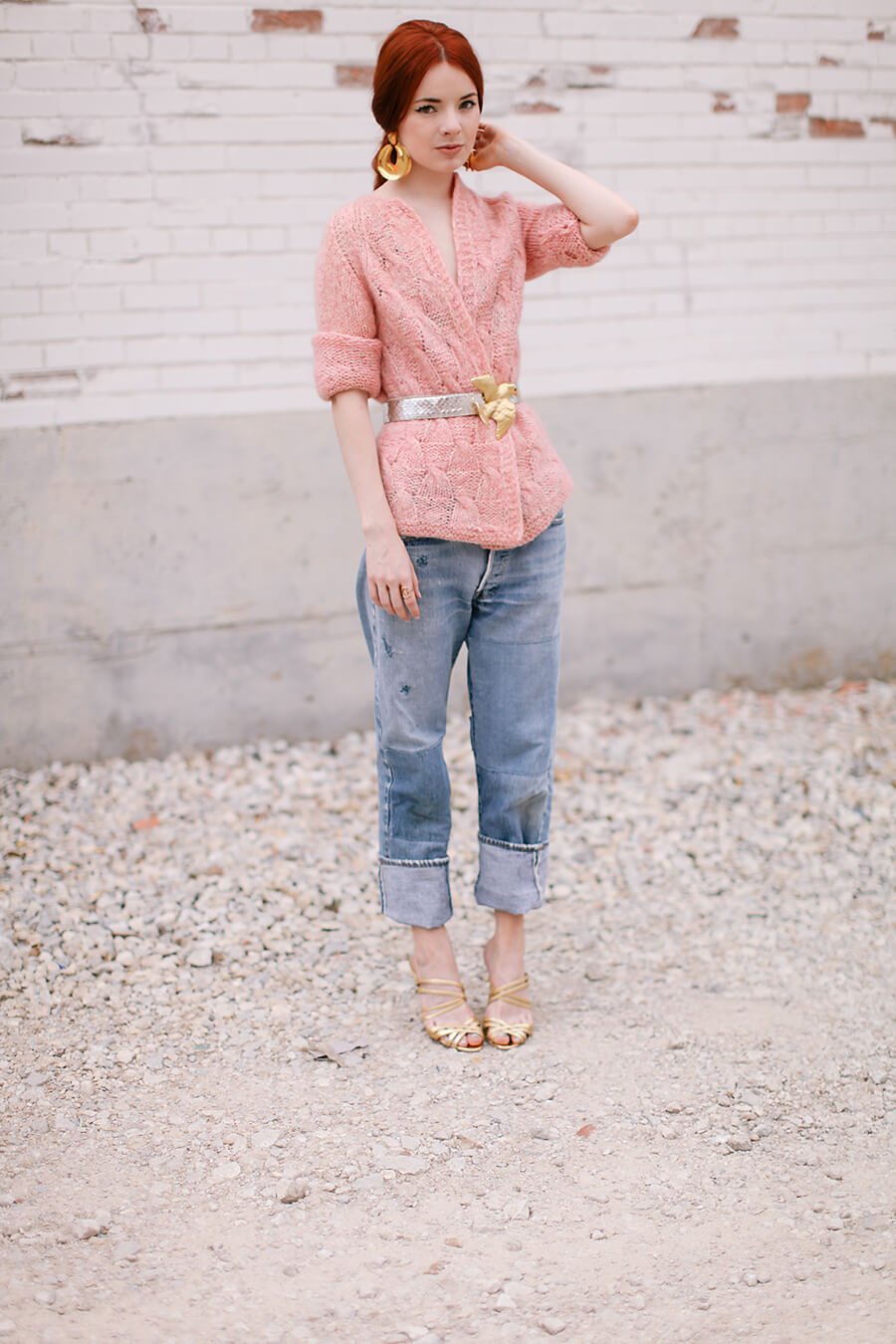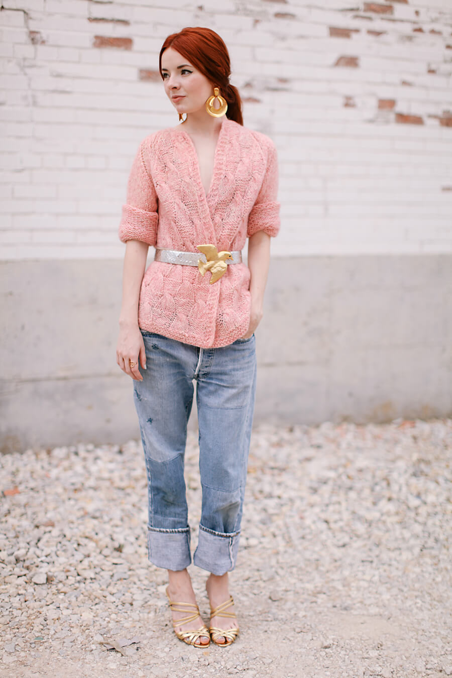 Thrifted wooly pink vintage sweater worn with a vintage Christopher Ross dove belt, jeans from Urban Outfitters Vintage, thrifted gold hoop earrings, and my new Oscar de la Renta mules I blogged last week.