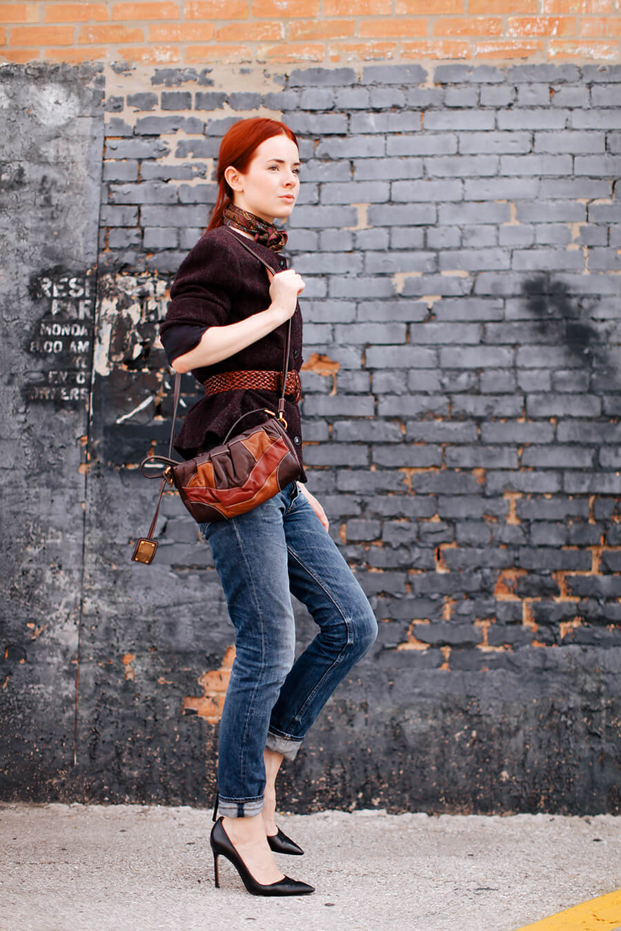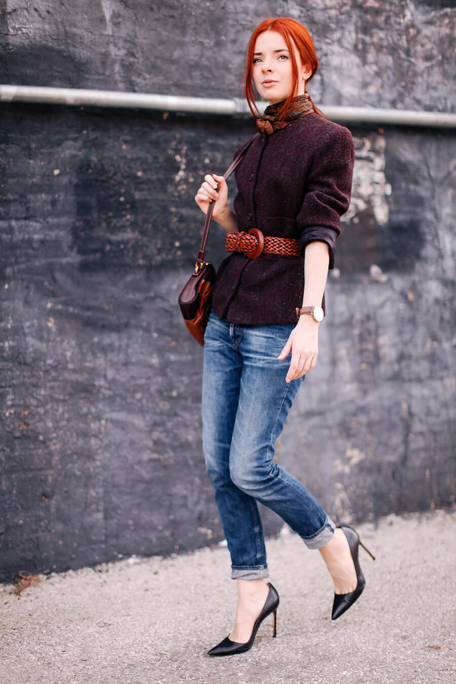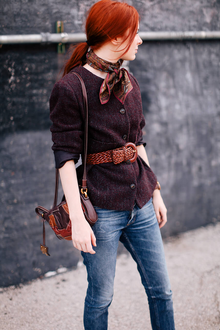 I’m really hung up on the combination of silk scarves and vintage boucle lately. I’ve amassed a tiny collection from years of vintage scavenging but this particular maroon jacket was a recent find. I’ve taken a life-long stance against the color maroon and certain shades of “murple” (too funeral homey) but this stands as an exception to my rule. The paisley silk scarf is Ralph Lauren, I was thrilled to find it to go with this jacket! They make a very cute couple. It is nice to have a polished scarf/jacket pairing to rely on in your wardrobe!